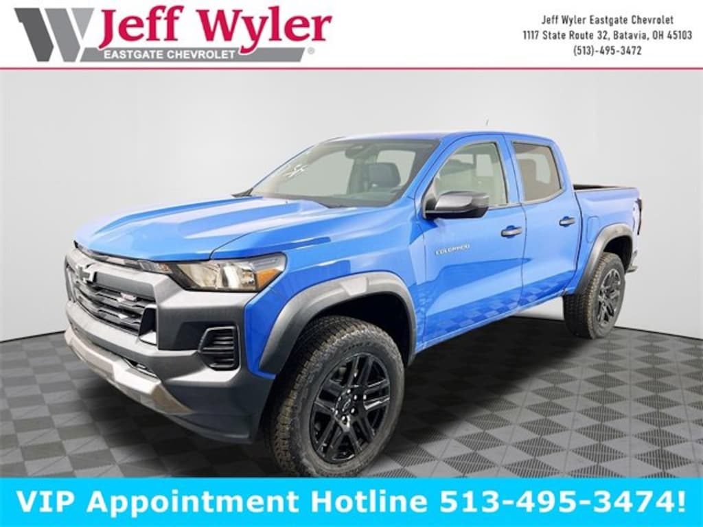 Reef Blue Metallic 2025 Chevrolet Colorado Trail Boss 2.7L I4 Turbocharged DOHC 16V LEV3-ULEV50 310hp 4WD 8-Speed Automatic 18/23 City/Highway MPG Jeff Wyler Eastgate Auto Mall is very proud to offer this terrific-looking 2025 Chevrolet Colorado Trail Boss in Reef Blue Metallic. Well equipped with: Preferred Equipment Group 0TR (Automatic Emergency Braking, Chevy Safety Assist, Following Distance Indicator, Forward Collision Alert, Front Pedestrian & Bicyclist Braking, IntelliBeam Automatic High Beam On/Off, and Lane Keep Assist w/Lane Departure Warning), Trail Boss Convenience Package II (4-Spoke Wrapped Steering Wheel, 8-Way Power Driver Seat Adjuster, Evotex Seat Trim, Heated Driver & Front Passenger Seats, Heated Steering Wheel, Power Driver Lumbar Control Seat Adjuster, Remote Vehicle Starter System, and Wireless Phone Charging), 3.42 Rear Axle Ratio, 4-Way Manual Passenger Seat Adjuster, 4-Wheel Disc Brakes, 6 Speakers, 6-Speaker Audio System Feature, 6-Way Manual Driver Seat Adjuster, ABS brakes, Air Conditioning, Alloy wheels, AM/FM radio: SiriusXM, Apple CarPlay/Android Auto, Auto High-beam Headlights, Automatic temperature control, Black Spray-On Bedliner w/Chevrolet Logo, Brake assist, Cloth Seat Trim, Compass, Delay-off headlights, Driver door bin, Driver vanity mirror, Dual front impact airbags, Dual front side impact airbags, Electronic Stability Control, Emergency communication system: OnStar, Front anti-roll bar, Front Bucket Seats, Front Center Armrest, Front dual zone A/C, Front wheel independent suspension, Heated door mirrors, Illuminated entry, Low tire pressure warning, Navigation System, Occupant sensing airbag, Outside temperature display, Overhead airbag, Overhead console, Panic alarm, Passenger door bin, Passenger vanity mirror, Power door mirrors, Power steering, Power windows, Radio data system, Radio: 11.3 Diagonal Advanced Color LCD Display, Rear reading lights, Rear step bumper, Rear window defroster, Remote keyless entry, Removable Front & Rear Off-Road Assist Steps (LPO), Rocker Panel Protector (LPO), Security system, SiriusXM Trial Subscription, Speed control, Speed-sensing steering, Split folding rear seat, Steering Wheel Mounted Audio Controls, Steering wheel mounted audio controls, Tachometer, Tilt steering wheel, Traction control, Trip computer, Variably intermittent wipers, Wheels: 18 x 8.5 Black High Gloss Aluminum, Wheels: 20 x 9 High Gloss Black Aluminum, and Wireless Phone Projection. Price includes: $500 - Chevrolet Consumer Cash Program. Exp. 03/02/2026