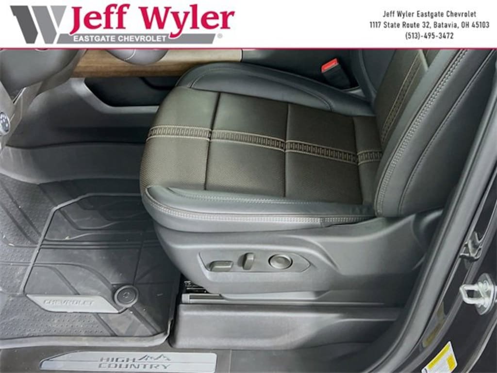 Black 2026 Chevrolet Silverado 1500 High Country 3.0L I6 4WD 10-Speed Automatic 22/25 City/Highway MPG Jeff Wyler Eastgate Auto Mall is pumped up to offer this good-looking 2026 Chevrolet Silverado 1500 High Country in Black. Well equipped with: High Capacity Suspension Package, High Country Premium II Super Cruise Package (Power-Retractable Assist Steps, Sport Wrapped Steering Wheel, and Super Cruise), High Country Premium Package (All-Weather Floor Liner (LPO), Power Sunroof, and Wheels: 22 x 9 Painted Aluminum), Preferred Equipment Group 3LZ (10-Way Power Driver Seat w/Lumbar, 10-Way Power Passenger Seat Adjuster w/Lumbar, 12.3 Multicolor Reconfigurable Digital Display, 120-Volt Bed Mounted Power Outlet, 120-Volt Interior Power Outlet, 2 USB Data Ports, 2nd Row Heated Outboard Seats, Adaptive Cruise Control, Auto-Dimming Inside Rear-View Mirror, Auto-Locking Rear Differential, Bed View Camera, Bluetooth® For Phone, Chevytec Spray-On Black Bedliner, Chrome Assist Steps, Chrome Recovery Hooks, Color-Keyed Carpeting Floor Covering, Deep-Tinted Glass, Driver Memory, Dual Exhaust w/Polished Outlets, Dual Rear USB Ports (Charge Only), Electric Rear-Window Defogger, Floor Mounted Center Console, Front Carpeted Floor Mats, Front LED Fog Lamps, Front Rain-Sensing Wipers, Galvano Silver Painted Mirror Caps, HD Surround Vision, Heated Driver & Front Outboard Passenger Seats, Heated Steering Wheel, Hitch Guidance w/Hitch View, In-Vehicle Trailering System App, Integrated Trailer Brake Controller, Keyless Open & Start, LED Cargo Area Lighting, OnStar Services Capable, Outside Heated Power-Adjustable Mirrors, Perimeter Lighting, Power Front Passenger Windows w/Express Up/Down, Power Front Windows w/Driver Express Up/Down, Power Rear Windows w/Express Down, Power Sliding Rear Window w/Rear Defogger, Power Tailgate, Power Tilt & Telescoping Steering Column, Rear Carpeted Floor Mats, Rear Cross Traffic Braking, Rear Pedestrian Alert, Rear Wheelhouse Liners, Remote Vehicle Starter System, Safety Alert Seat, SiriusXM w/360L Trial Subscription, Standard Tailgate, Steering Wheel Audio Controls, Teen Driver, Theft Deterrent System (Unauthorized Entry), Tire Pressure Monitoring System, Trailer Camera Provisions, Trailer Side Blind Zone Alert, Ultrasonic Front & Rear Park Assist, Universal Home Remote, Ventilated Driver & Front Passenger Seats, Wi-Fi Hot Spot Capable, and Wrapped Steering Wheel), Technology Package (15 Diagonal Multicolor Head-Up Display and Rear Camera Mirror), Trailering Package (Hitch Guidance), Up-Level Rear Seat w/Storage Package, 170 Amp Alternator, 220 Amp Alternator, 3.23 Rear Axle Ratio, 4-Wheel Disc Brakes, 7 Speakers, ABS brakes, Adaptive Ride Control Suspension, Air Conditioning, Alloy wheels, AM/FM radio: SiriusXM with 360L, Apple CarPlay/Android Auto, Auto High-beam Headlights, Auto-dimming door mirrors, Auto-dimming Rear-View mirror, Automatic temperature control, Bodyside moldings, Brake assist, Bumpers: body-color, Compass, Delay-off headlights, Driver door bin, Driver vanity mirror, Dual front impact airbags, Dual front side impact airbags, Electronic Stability Control, Electronic Transmission Range Selector Shifter, Emergency communication system: OnStar, Engine Block Heater, Enhanced Automatic Emergency Braking, Following Distance Indicator, Forward Collision Alert, Front anti-roll bar, Front Bucket Seats, Front Center Armrest, Front dual zone A/C, Front fog lights, Front Pedestrian Braking, Front reading lights, Front wheel independent suspension, Fully automatic headlights, Garage door transmitter, Genuine wood console insert, Genuine wood dashboard insert, Genuine wood door panel insert, Heated door mirrors, Heated front seats, Heated rear seats, Heated steering wheel, Illuminated entry, IntelliBeam Automatic High Beam On/Off, Lane Keep Assist w/Lane Departure Warning, Low tire pressure war Price includes: $1750 - GM Bonus Cash. Exp. 01/02/2026 $2500 - Chevrolet Consumer Cash Program. Exp. 01/02/2026