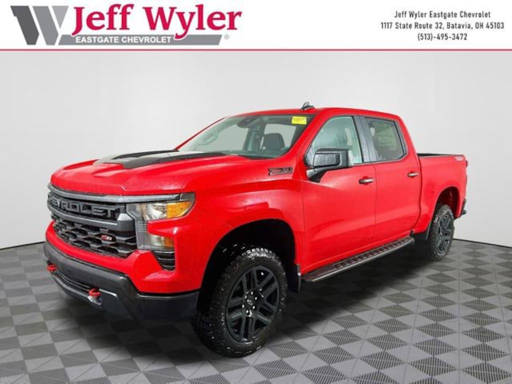 Red Hot 2026 Chevrolet Silverado 1500 Custom Trail Boss 2.7L I4 Turbocharged DOHC 16V LEV3-SULEV30 310hp 4WD 8-Speed Automatic 16/17 City/Highway MPG Jeff Wyler Eastgate Auto Mall is delighted to offer this superb-looking 2026 Chevrolet Silverado 1500 Custom Trail Boss in Red Hot. Well equipped with: Custom Convenience Package (Electric Rear-Window Defogger, LED Cargo Area Lighting, and Remote Vehicle Starter System), Preferred Equipment Group 2CX (120-Volt Bed Mounted Power Outlet, 120-Volt Interior Power Outlet, 3.5 Monochromatic Display Driver Info Center, 40/20/40 Front Split-Bench Seat, Auto-Locking Rear Differential, Bluetooth® For Phone, Cloth Seat Trim, Color-Keyed Carpeting Floor Covering, Deep-Tinted Glass, Electronic Cruise Control, Front Rubberized Vinyl Floor Mats, HD Rear Vision Camera, Manual Tilt Wheel Steering Column, OnStar Services Capable, Performance Red Recovery Hooks, Rear Rubberized-Vinyl Floor Mats, Remote Keyless Entry, SiriusXM Trial Subscription, Standard Tailgate, Teen Driver, Tire Pressure Monitoring System, Wheels: 18 x 8.5 Black Painted Aluminum, and Wi-Fi Hot Spot Capable), Suspension Package (Heavy-Duty Air Filter and Hill Descent Control), Trailering Package (Hitch Guidance), 220 Amp Alternator, 3.42 Rear Axle Ratio, 4-Wheel Disc Brakes, 6 Speakers, 6-Speaker Audio System, ABS brakes, Air Conditioning, Alloy wheels, AM/FM radio: SiriusXM, Apple CarPlay/Android Auto, Auto High-beam Headlights, Automatic Emergency Braking, Brake assist, Compass, Delay-off headlights, Driver door bin, Driver vanity mirror, Dual front impact airbags, Dual front side impact airbags, Electronic Stability Control, Emergency communication system: OnStar, Following Distance Indicator, Forward Collision Alert, Front anti-roll bar, Front Center Armrest w/Storage, Front Pedestrian Braking, Front reading lights, Front wheel independent suspension, Fully automatic headlights, Heated door mirrors, Illuminated entry, Integrated Trailer Brake Controller, Low tire pressure warning, Occupant sensing airbag, Outside temperature display, Overhead airbag, Overhead console, Panic alarm, Passenger door bin, Passenger vanity mirror, Power door mirrors, Power driver seat, Power steering, Power windows, Premium audio system: Chevrolet Infotainment 3, Radio data system, Radio: Chevrolet Infotainment 3 System, Rear reading lights, Rear step bumper, Rear window defroster, Remote keyless entry, Security system, Single Outlet Exhaust, Speed control, Speed-sensing steering, Split folding rear seat, Tachometer, Tilt steering wheel, Traction control, Trip computer, Variably intermittent wipers, and Voltmeter. Price includes: $2000 - Chevrolet Consumer Cash Program. Exp. 04/30/2026