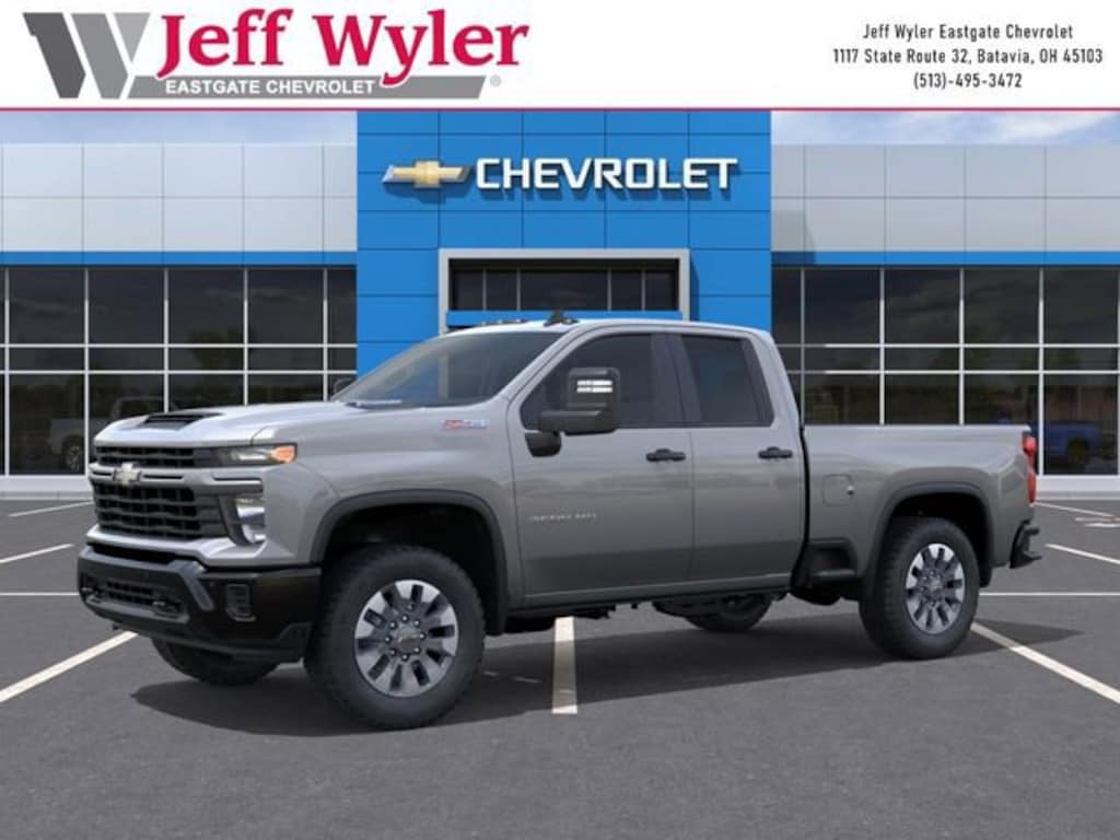 Sterling Gray Metallic 2026 Chevrolet Silverado 2500HD Custom Duramax 6.6L V8 Turbodiesel 4WD 10-Speed Automatic Jeff Wyler Eastgate Auto Mall is pumped up to offer this superb 2026 Chevrolet Silverado 2500HD Custom in Sterling Gray Metallic. Well equipped with: Custom Convenience Package (10-Way Power Driver Seat Adjuster with Lumbar, 120-Volt Bed Mounted Power Outlet, 120-Volt Interior Power Outlet, Dual Rear USB Ports (charge Only), Electric Rear-Window Defogger, EZ Lift Power Lock and Release Tailgate, LED Cargo Area Lighting, Remote Vehicle Starter System, and Unauthorized Entry Theft-Deterrent System), Custom Value Package (Auto-Dimming Inside Rear-View Mirror and Heated and Auto-Dimming Vertical Trailering Mirrors), CX Safety Package (Lane Change Alert with Side Blind Zone Alert, Rear Cross Traffic Alert, and Ultrasonic Front and Rear Park Assist), Gooseneck/5th Wheel Prep Package (Black Chevytec Spray-on Bedliner), Preferred Equipment Group 1CX (170 Amp Alternator, 2-Speed Electronic Shift Transfer Case, 3.5 Diagonal Monochromatic Display DIC, Black Mirror Caps, Bluetooth® For Phone, Chevrolet Connected Access Capable, Color-Keyed Carpeting Floor Covering, Compass, Deep-Tinted Glass, Durabed Pickup Bed, Electronic Cruise Control with Set and Resume Speed, Front Rubberized Vinyl Floor Mats, HD Rear Vision Camera, Heated Vertical Trailering Mirrors, Locking Tailgate, Manual Tailgate Function with No EZ Lift, Manual Tilt-Wheel Steering Column, OnStar Services Capable, Power Door Locks, Power Front Windows with Driver Express Up/Down, Power Front Windows with Passenger Express Down, Power Rear Windows with Express Down, Push Button Start, Rear 60/40 Folding Bench Seat (folds Up), Rear Rubberized Vinyl Floor Mats, Remote Keyless Entry, SiriusXM with 360L Trial Subscription, Standard Tailgate, Wheels: 20 10-Spoke Machined Aluminum, Wi-Fi Hotspot Capable, and Wireless Phone Projection), Suspension Package, Z71 Off-Road Package (Hill Descent Control and Off-Road Suspension), 220 Amp Alternator, 4-Wheel Disc Brakes, 6 Speakers, 6-Speaker Audio System, 720 Cold-Cranking Amps Heavy-Duty Battery, ABS brakes, Air Conditioning, Alloy wheels, AM/FM radio: SiriusXM with 360L, Apple CarPlay/Android Auto, Auto High-beam Headlights, Brake assist, Cloth Seat Trim, Delay-off headlights, Driver door bin, Dual front impact airbags, Dual front side impact airbags, Electronic Stability Control, Emergency communication system: OnStar, Engine Block Heater, Exhaust Brake, Front 40/20/40 Split-Bench Seats with Lockable Storage, Front anti-roll bar, Front Center Armrest w/Storage, Front reading lights, Front wheel independent suspension, Fully automatic headlights, Heated door mirrors, Illuminated entry, LED Smoked Amber Roof Marker Lamps, Low tire pressure warning, Occupant sensing airbag, Outside temperature display, Overhead airbag, Overhead console, Panic alarm, Passenger door bin, Passenger vanity mirror, Power door mirrors, Power steering, Power windows, Premium audio system: Chevrolet Infotainment 3, Radio: Chevrolet Infotainment 3 System, Rear reading lights, Rear step bumper, Remote keyless entry, Speed control, Split folding rear seat, Tachometer, Tilt steering wheel, Traction control, Trip computer, Turn signal indicator mirrors, Variably intermittent wipers, Voltmeter, and Winter Grille Cover. Price includes: $1000 - Chevrolet Consumer Cash Program. Exp. 04/30/2026