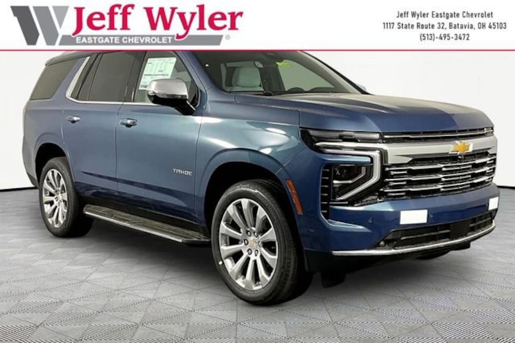Lakeshore Blue Metallic 2026 Chevrolet Tahoe Premier EcoTec3 5.3L V8 4WD 10-Speed Automatic with Overdrive 15/19 City/Highway MPG Jeff Wyler Eastgate Auto Mall is honored to offer this great-looking 2026 Chevrolet Tahoe Premier in Lakeshore Blue Metallic. Well equipped with: Advanced Security Package (Glass Breakage Sensor, Theft-Deterrent Alarm System, Vehicle Inclination Sensor, and Vehicle Interior Movement Sensor), Preferred Equipment Group 1LZ (1st and 2nd Row Color-Keyed Carpeted Floor Mats, 20 x 9 Polished Aluminum Wheels, 3-Spoke Wrapped Steering Wheel, 3rd Row 60/40 Power-Folding Split-Bench Seat, Auto-Dimming Inside Rear-View Mirror, Bose 10-Speaker Centerpoint Surround Audio System Feature, Bright Front and Rear Door Sill Plates, Chrome Door Handles with Body-Color Strip, Chrome Mirror Caps, Color-Keyed Carpeting Floor Covering, Dual Exhaust System, Floor Console, Front Bucket Seats, Front LED Fog Lamps, Frontal Driver and Outboard Passenger Airbags, Heated 2nd Row Outboard Seats, Heated Steering Wheel, Interior Camera, Key Card, LED Headlamps with LED Daytime Running Lamps, LED Tail Lamps, Magnetic Ride Control Suspension, Memory Settings, Outside Heated Power-Adjustable Mirrors, Power Release 2nd Row Bucket Seats, Power Tilt and Telescopic Steering Column, Rear Power Liftgate, Remote Start, SiriusXM with 360L Trial Subscription, Universal Home Remote, and Wireless Phone Charging), Technology & Entertainment Package (Dual-Pane Power Panoramic Sunroof and Rear Seat Media System), Technology Package (15 Diagonal Multi-Color Head-Up Display, AutoSense Hands-Free Power Liftgate, and Inside Rearview Auo-Dimming Rear Camera Mirror), 10 Speakers, 3.23 Rear Axle Ratio, 3rd row seats: split-bench, 4-Way Power Driver Lumbar Seat Adjuster, 4-Way Power Front Passenger Lumbar Seat Adjuster, 4-Wheel Disc Brakes, 8-Way Power Driver Seat Adjuster, 8-Way Power Front Passenger Seat Adjuster, ABS brakes, Adaptive suspension, Air Conditioning, Alloy wheels, AM/FM radio: SiriusXM with 360L, Apple CarPlay/Android Auto, Auto High-beam Headlights, Auto-dimming door mirrors, Auto-dimming Rear-View mirror, Auto-leveling suspension, Automatic temperature control, Brake assist, Bumpers: body-color, Compass, Delay-off headlights, Driver and Front Passenger Heated and Ventilated Seats, Driver door bin, Driver vanity mirror, Dual front impact airbags, Dual front side impact airbags, Electronic Stability Control, Emergency communication system: OnStar and Chevrolet connected services capable, Exterior Parking Camera Rear, Four wheel independent suspension, Front anti-roll bar, Front Center Armrest, Front dual zone A/C, Front fog lights, Front reading lights, Fully automatic headlights, Garage door transmitter, Heated door mirrors, Heated Driver and Front Passenger Seats, Heated front seats, Heated rear seats, Heated steering wheel, Illuminated entry, Low tire pressure warning, Memory seat, Navigation system: Google built-in compatibility (select service plan required, terms and limitations apply), Occupant sensing airbag, Outside temperature display, Overhead airbag, Overhead console, Panic alarm, Passenger door bin, Passenger vanity mirror, Perforated Leather Seat Trim, Power door mirrors, Power driver seat, Power Liftgate, Power passenger seat, Power steering, Power windows, Premium audio system: Chevrolet Infotainment 3 Premium, Radio data system, Radio: 17.7 Diagonal Advanced Color LCD Display, Rain sensing wipers, Rear air conditioning, Rear anti-roll bar, Rear reading lights, Rear window defroster, Rear window wiper, Remote keyless entry, Security system, Set of 4 Wheel Locks, Speed control, Speed-sensing steering, Split folding rear seat, Spoiler, Steering wheel memory, Steering wheel mounted audio controls, Tachometer, Telescoping steering wheel, Tilt steering wheel, Traction control, Trip computer, Turn signal indicator mirrors, Variably intermittent wipers, Ventilated front seats, Voltmeter, and Wheels: 22 x 9 Manoogian Silver