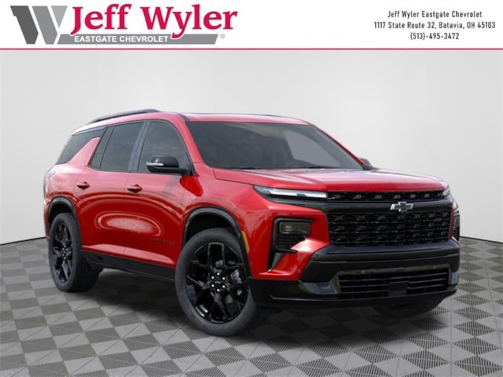 Radiant Red Tintcoat 2026 Chevrolet Traverse RS 2.5L DOHC FWD 8-Speed Automatic 20/26 City/Highway MPG Jeff Wyler Eastgate Auto Mall is proud to offer this handsome 2026 Chevrolet Traverse RS in Radiant Red Tintcoat. Well equipped with: Interior Protection Package (1st and 2nd Row All-Weather Floor Mats, 3rd Row All-Weather Floor Liner, and Cargo Mat), Preferred Equipment Group 1RS, 12 Speakers, 3rd row seats: split-bench, 4-Wheel Disc Brakes, 6-Way Power Front Passenger Seat Adjuster, 8-Way Power Driver Seat Adjuster, ABS brakes, Air Conditioning, Alloy wheels, AM/FM radio: SiriusXM with 360L, Apple CarPlay/Android Auto, Auto High-beam Headlights, Auto tilt-away steering wheel, Auto-dimming door mirrors, Automatic temperature control, Bose Premium 12-Speaker Audio System Feature, Brake assist, Bumpers: body-color, Child-Seat-Sensing Airbag, Compass, Delay-off headlights, Driver 4-Way Power Lumbar Seat Adjuster, Driver door bin, Driver vanity mirror, Dual front impact airbags, Dual front side impact airbags, Electronic Stability Control, Emergency communication system: OnStar, Exterior Parking Camera Rear, Four wheel independent suspension, Front anti-roll bar, Front Bucket Seats, Front Center Armrest, Front dual zone A/C, Front Passenger 4-Way Power Lumbar Seat Adjuster, Front reading lights, Fully automatic headlights, Garage door transmitter, Heated door mirrors, Heated Driver and Front Passenger Seats, Heated front seats, Heated rear seats, Heated steering wheel, Illuminated entry, Low tire pressure warning, Memory seat, Navigation System, Occupant sensing airbag, Outside temperature display, Overhead airbag, Overhead console, Panic alarm, Passenger door bin, Passenger vanity mirror, Perforated Leather-Appointed Seat Trim, Power door mirrors, Power driver seat, Power Dual Glass Panoramic Sliding Sunroof, Power Liftgate, Power passenger seat, Power steering, Power windows, Radio data system, Radio: : Audio System w/17.7 Diagonal Display, Rain sensing wipers, Rear air conditioning, Rear anti-roll bar, Rear reading lights, Rear window defroster, Rear window wiper, Remote keyless entry, RS Black Nameplate Kit (LPO), Security system, SiriusXM with 360L Trial Subscription, Speed control, Speed-sensing steering, Spoiler, Sport steering wheel, Steering wheel memory, Steering wheel mounted audio controls, Tachometer, Telescoping steering wheel, Tilt steering wheel, Traction control, Trip computer, Turn signal indicator mirrors, Variably intermittent wipers, Ventilated Driver and Front Passenger Seats, Ventilated front seats, Voltmeter, and Wheels: 22 High Gloss Black Painted Aluminum. 20/26 City/Highway MPG