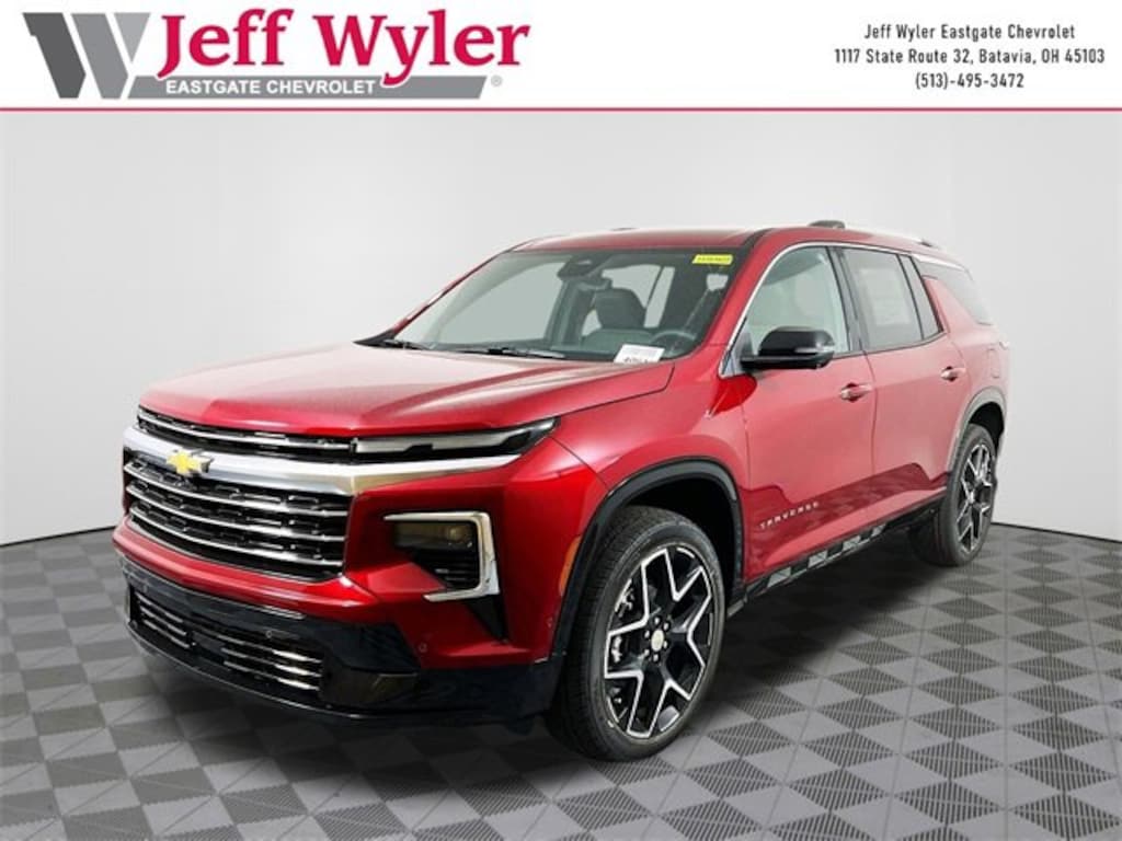 Radiant Red Tintcoat 2026 Chevrolet Traverse High Country 2.5L DOHC FWD 8-Speed Automatic 20/27 City/Highway MPG Jeff Wyler Eastgate Auto Mall is honored to offer this great-looking 2026 Chevrolet Traverse High Country in Radiant Red Tintcoat. Well equipped with: Preferred Equipment Group 1LZ, 12 Speakers, 3rd row seats: split-bench, 4-Wheel Disc Brakes, 6-Way Power Front Passenger Seat Adjuster, 8-Way Power Driver Seat Adjuster, ABS brakes, Air Conditioning, Alloy wheels, AM/FM radio: SiriusXM with 360L, Apple CarPlay/Android Auto, Auto High-beam Headlights, Auto tilt-away steering wheel, Auto-dimming door mirrors, Automatic temperature control, Bose Premium 12-Speaker Audio System Feature, Brake assist, Bumpers: body-color, Child-Seat-Sensing Airbag, Compass, Delay-off headlights, Driver 4-Way Power Lumbar Seat Adjuster, Driver door bin, Driver vanity mirror, Dual front impact airbags, Dual front side impact airbags, Electronic Stability Control, Emergency communication system: OnStar, Exterior Parking Camera Rear, Four wheel independent suspension, Front anti-roll bar, Front Bucket Seats, Front Center Armrest, Front dual zone A/C, Front Passenger 4-Way Power Lumbar Seat Adjuster, Front reading lights, Fully automatic headlights, Garage door transmitter, Heated door mirrors, Heated front seats, Heated rear seats, Heated steering wheel, Illuminated entry, Low tire pressure warning, Memory seat, Navigation System, Occupant sensing airbag, Outside temperature display, Overhead airbag, Overhead console, Panic alarm, Passenger door bin, Passenger vanity mirror, Perforated Leather-Appointed Seat Trim, Power door mirrors, Power driver seat, Power Liftgate, Power passenger seat, Power steering, Power windows, Radio data system, Rain sensing wipers, Rear air conditioning, Rear anti-roll bar, Rear reading lights, Rear window defroster, Rear window wiper, Remote keyless entry, Security system, Speed control, Speed-sensing steering, Spoiler, Steering wheel memory, Steering wheel mounted audio controls, Tachometer, Telescoping steering wheel, Tilt steering wheel, Traction control, Trip computer, Turn signal indicator mirrors, Variably intermittent wipers, Ventilated front seats, Voltmeter, and Wheels: 22 High-Gloss Black Aluminum. 20/27 City/Highway MPG