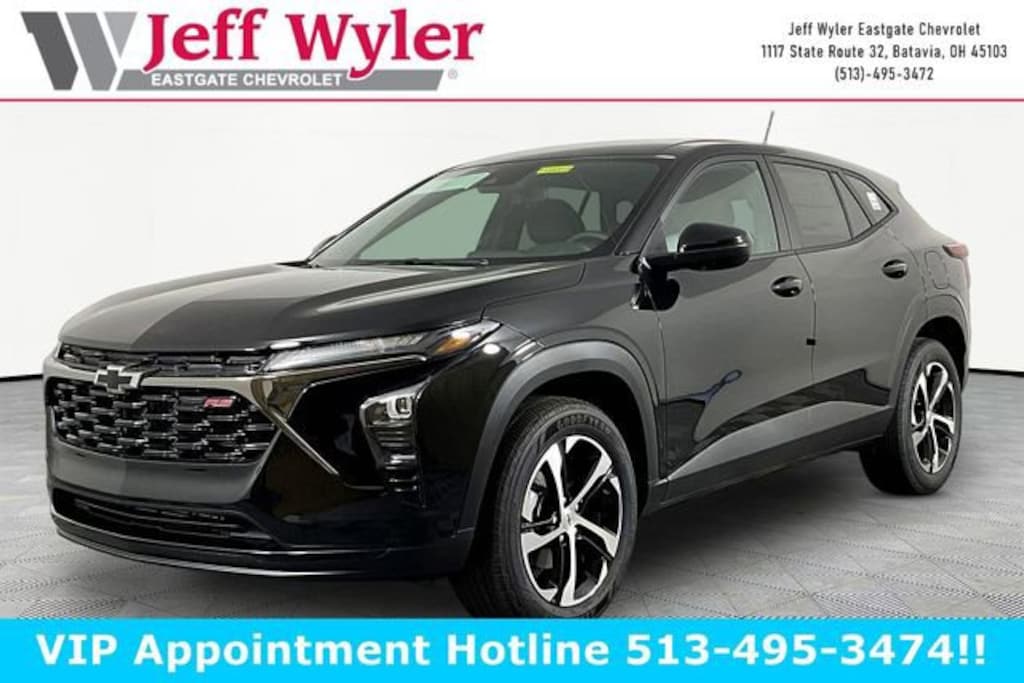 Mosaic Black Metallic 2026 Chevrolet Trax 1RS ECOTEC 1.2L Turbo FWD 6-Speed Automatic 28/32 City/Highway MPG Jeff Wyler Eastgate Auto Mall is honored to offer this attractive 2026 Chevrolet Trax 1RS in Mosaic Black Metallic. Well equipped with: Driver Confidence Package (Lane Change Alert with Side Blind Zone Alert, Rear Cross Traffic Alert, and Rear Park Assist), Preferred Equipment Group 1RS, Sunroof Package (Power Sliding Glass Sunroof with Manual Shade), 2-Way Adjustable Front Head Restraints, 3.50 Final Drive Axle Ratio, 4 Speakers, 4-Speaker Audio System Feature, 4-Way Manual Front Passenger Seat Adjuster, 4-Wheel Disc Brakes, 6-Way Manual Driver Seat Adjuster, ABS brakes, Air Conditioning, Alloy wheels, AM/FM radio: SiriusXM, Auto High-beam Headlights, Brake assist, Bumpers: body-color, Cloth Seat Trim, Compass, Delay-off headlights, Driver door bin, Driver vanity mirror, Dual front impact airbags, Dual front side impact airbags, Electronic Stability Control, Emergency communication system: OnStar One Essentials, Exterior Parking Camera Rear, Front anti-roll bar, Front Bucket Seats, Front Center Armrest, Front reading lights, Front wheel independent suspension, Fully automatic headlights, Heated door mirrors, Heated Driver and Front Passenger Seats, Heated front seats, Heated steering wheel, Illuminated entry, Leather steering wheel, Low tire pressure warning, Occupant sensing airbag, Outside temperature display, Overhead airbag, Overhead console, Panic alarm, Passenger door bin, Passenger vanity mirror, Power door mirrors, Power steering, Power windows, Premium audio system: Chevrolet Infotainment 3, Radio data system, Radio: Chevrolet Infotainment 3 System with AM/FM, Rear window defroster, Rear window wiper, Remote keyless entry, Security system, SiriusXM Trial Subscription, Speed control, Split folding rear seat, Spoiler, Sport steering wheel, Steering wheel mounted audio controls, Tachometer, Telescoping steering wheel, Tilt steering wheel, Traction control, Trip computer, Variably intermittent wipers, Wheels: 18 Black-Painted Machined Aluminum, and Wireless Apple CarPlay/Wireless Android Auto. 28/32 City/Highway MPG Awards: