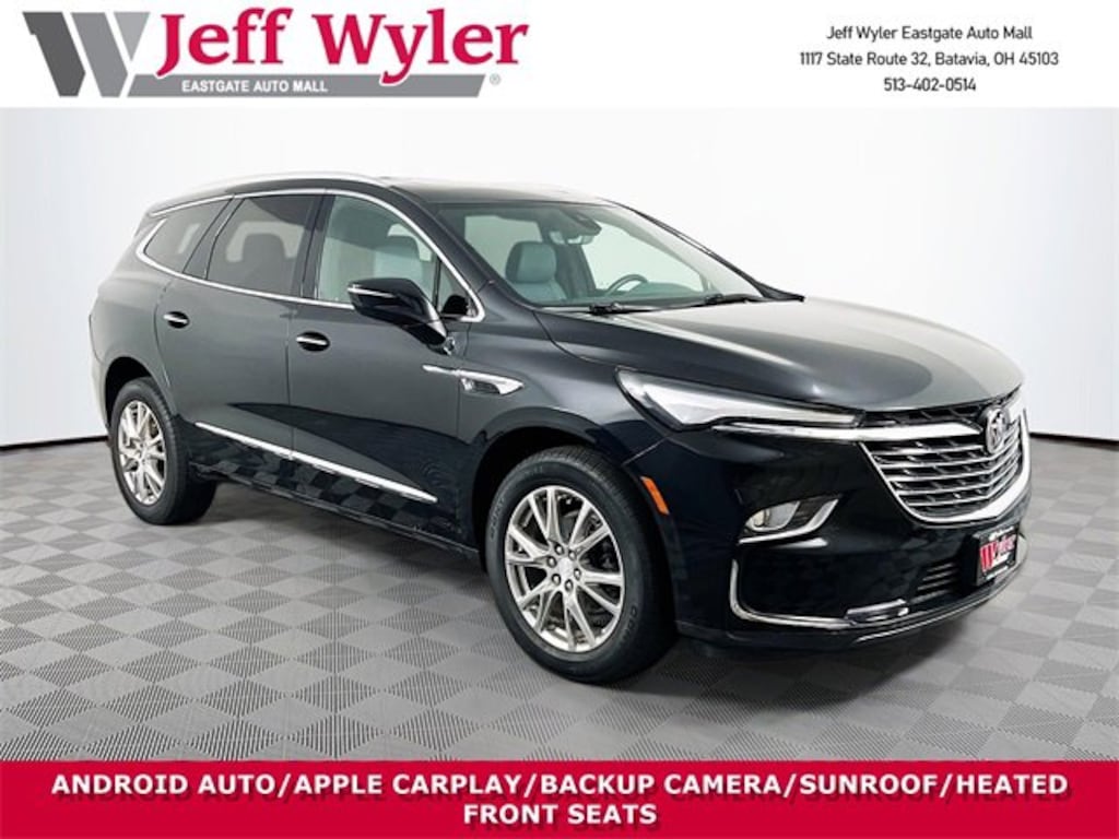Jeff Wyler Eastgate Auto Mall is excited to offer this beautiful-looking 2022 Buick Enclave Essence in Ebony Twilight Metallic. Well equipped with: Experience Buick Package (Front Power Sliding Moonroof), Front Mounting License Plate Bracket Package, Preferred Equipment Group 1SL (Front & Rear Park Assist and Heated Steering Wheel), Sound & Sites Package (120-Volt Power Outlet, Bose Performance-Enhanced 10-Speaker System, Radio: Buick Infotainment Sys AM/FM Stereo w/Nav, and SiriusXM w/360L), Technology Package (Adaptive Cruise Control, Enhanced Automatic Emergency Braking, HD Surround Vision, Inside Rearview Mirror w/Full Camera Display, Rear Camera Mirror Washer, and Rear Pedestrian Alert), 18 Aluminum Wheels, 20 Polished Aluminum Wheels, 3.49 Axle Ratio, 3rd row seats: split-bench, 4-Wheel Disc Brakes, 6 Speakers, 6-Speaker Audio System Feature, 6-Way Power Front Passenger Seat Adjuster, 7-Passenger Seating, 8-Way Power Driver Seat Adjuster, ABS brakes, Air Conditioning, Alloy wheels, AM/FM radio: SiriusXM with 360L, Auto High-beam Headlights, Auto-dimming door mirrors, Auto-dimming Rear-View mirror, Automatic temperature control, Brake assist, Bumpers: body-color, Compass, Delay-off headlights, Driver door bin, Driver vanity mirror, Dual front impact airbags, Dual front side impact airbags, Electronic Stability Control, Emergency communication system: OnStar and Buick connected services capable, Four wheel independent suspension, Front anti-roll bar, Front Bucket Seats, Front Center Armrest, Front dual zone A/C, Front reading lights, Fully automatic headlights, Garage door transmitter, Heated door mirrors, Heated Driver & Front Passenger Seats, Heated front seats, Heated steering wheel, Illuminated entry, Leather steering wheel, Low tire pressure warning, Not Equipped w/Front & Rear Park Assist, Not Equipped w/Heated Steering Wheel (DISC), Occupant sensing airbag, Outside temperature display, Overhead airbag, Overhead console, Panic alarm, Passenger door bin, Passenger vanity mirror, Perforated Leather-Appointed Seat Trim, Power door mirrors, Power Driver Lumbar Control Seat Adjuster, Power driver seat, Power Liftgate, Power Passenger Lumbar Control Seat Adjuster, Power passenger seat, Power steering, Power windows, Premium audio system: Buick Infotainment System, Radio data system, Radio: Buick Infotainment System AM/FM Stereo, Rear air conditioning, Rear anti-roll bar, Rear reading lights, Rear window defroster, Rear window wiper, Remote keyless entry, Roof rack: rails only, Security system, Speed control, Speed-sensing steering, Spoiler, Steering wheel mounted audio controls, Tachometer, Telescoping steering wheel, Tilt steering wheel, Traction control, Trip computer, Turn signal indicator mirrors, Variably intermittent wipers, Voltmeter, and Wireless Apple CarPlay/Wireless Android Auto. CARFAX One-Owner. Ask about available certifications. Used vehicles 10 years of age or newer with less than 100,000 miles are eligible for the Wyler Assurance Program, but eligible vehicles must pass our reconditioning process and multi-point inspection. Provided the vehicle passes inspection, vehicles will be eligible for the 6 month/6,000 mile limited warranty. The 6 month/6,000 mile limited warranty is NOT available on AS-IS vehicles, wholesale vehicles, lease buyback/pass-thru vehicles or un-inspected vehicles. Note that this program can also apply to vehicles where the remaining factory coverage is less than 6 months or 6,000 miles. Please check the Federal Trade Commission (FTC) Buyers guide on the vehicle for full details as to whether or not warranty coverage may apply. Contact Dealer for additional details. The Wyler Assurance 6 month/6,000 Mile limited warranty ends 6 months from the date of the Retail Purchase Agreement (BUYERS ORDER) or when the vehicle's odometer registers 6,000 additional miles to the mileage listed on the BUYERS ORDER, whichever comes first. Your Deductibl