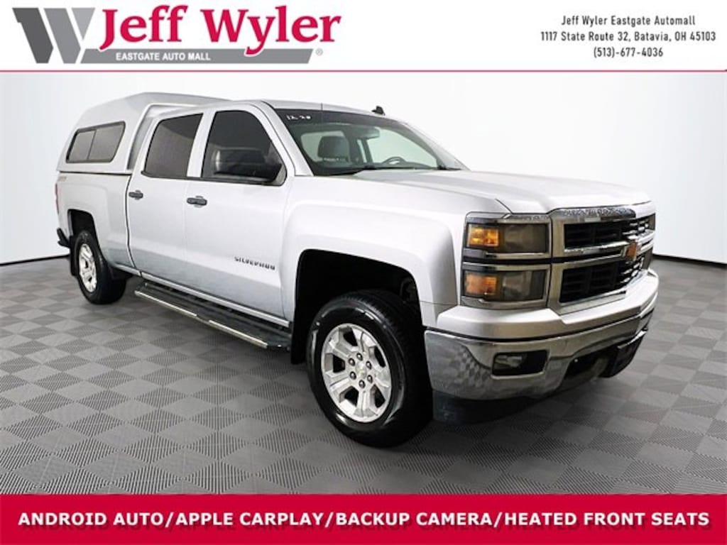 Jeff Wyler Eastgate Auto Mall is excited to offer this gorgeous 2014 Chevrolet Silverado 1500 LT in Silver Ice Metallic. Well equipped with: All Star Edition (110-Volt AC Power Outlet, Dual-Zone Automatic Climate Control, Electric Rear-Window Defogger, Radio: AM/FM 8 Diagonal Color Touch Screen, Rear Vision Camera w/Dynamic Guide Lines, Remote Vehicle Starter System, SiriusXM Satellite & HD Radio, and Theft Deterrent System (Unauthorized Entry)), LT Plus Package (Power Adjustable Pedals, Power Sliding Rear Window, Ultrasonic Rear Park Assist, and Universal Home Remote), Trailering Equipment, 10-Way Power Driver's Seat Adjuster, 150 Amp Alternator, 3.42 Rear Axle Ratio, 4-Wheel Disc Brakes, 4.2 Diagonal Color Display Driver Info Center, 40/20/40 Front Split Bench Seat, 6 Speaker Audio System, 6 Speakers, ABS brakes, Air Conditioning, Alloy wheels, AM/FM radio: SiriusXM, Auxiliary External Transmission Oil Cooler, Black Power Adjustable Heated Outside Mirrors, Bluetooth® For Phone, Brake assist, Bumpers: chrome, CD player, Cloth Seat Trim, Color-Keyed Carpeting w/Rubberized Vinyl Floor Mats, Compass, Deep-Tinted Glass, Delay-off headlights, Driver & Front Passenger Illuminated Vanity Mirrors, Driver door bin, Driver vanity mirror, Dual front impact airbags, Dual front side impact airbags, Electronic Stability Control, Emergency communication system: OnStar Directions & Connections, EZ Lift & Lower Tailgate, Front anti-roll bar, Front Center Armrest w/Storage, Front Chrome Bumper, Front Frame-Mounted Black Recovery Hooks, Front Halogen Fog Lamps, Front License Plate Kit, Front reading lights, Front wheel independent suspension, Fully automatic headlights, Heated door mirrors, Heated Driver & Front Passenger Seats, Heavy-Duty Rear Locking Differential, Illuminated entry, Leather Wrapped Steering Wheel w/Cruise Controls, LED Cargo Box Lighting, Low tire pressure warning, Manual Tilt Wheel Steering Column, Manual Tilt/Telescoping Steering Column, Occupant sensing airbag, OnStar 6 Months Directions & Connections Plan, Outside temperature display, Overhead airbag, Overhead console, Panic alarm, Passenger door bin, Passenger vanity mirror, Power door mirrors, Power steering, Power windows, Power Windows w/Driver Express Up, Premium audio system: Chevrolet MyLink, Radio data system, Radio: AM/FM Audio System w/Chevrolet MyLink, Rear 60/40 Folding Bench Seat (Folds Up), Rear Chrome Bumper, Rear reading lights, Rear seat center armrest, Rear step bumper, Rear Wheelhouse Liners, Remote Keyless Entry, Remote keyless entry, Single Slot CD/MP3 Player, Speed control, Speed-sensing steering, Split folding rear seat, Steering Wheel Audio Controls, Steering wheel mounted audio controls, Tachometer, Tilt steering wheel, Traction control, Trip computer, Variably intermittent wipers, Voltmeter, and Wheels: 17 x 8 Bright Machined Aluminum. Reviews:* New, more fuel-efficient engines; improved interior; quiet highway ride. Source: Edmunds* While we realize the majority of full-size truck buyers are predisposed towards their favorite brand, the 2014 Chevy Silverado makes a compelling case for itself. From its sophisticated-yet-easy-to-use infotainment system to its surprisingly refined interior, the 2014 Silverado deserves serious consideration from the brand faithful and cross-shoppers alike. Source: KBB.comAwards:* NACTOY 2014 North American Truck of the Year * 2014 KBB.com Brand Image Awards Ask about available certifications. Used vehicles 10 years of age or newer with less than 100,000 miles are eligible for the Wyler Assurance Program, but eligible vehicles must pass our reconditioning process and multi-point inspection. Provided the vehicle passes inspection, vehicles will be eligible for the 6 month/6,000 mile limited warranty. The 6 month/6,000 mile limited warranty is NOT available on AS-IS vehicles, wholesale vehicles, lease buyback/pass-thru vehicles or un-inspected vehicles. Note that this program can also apply