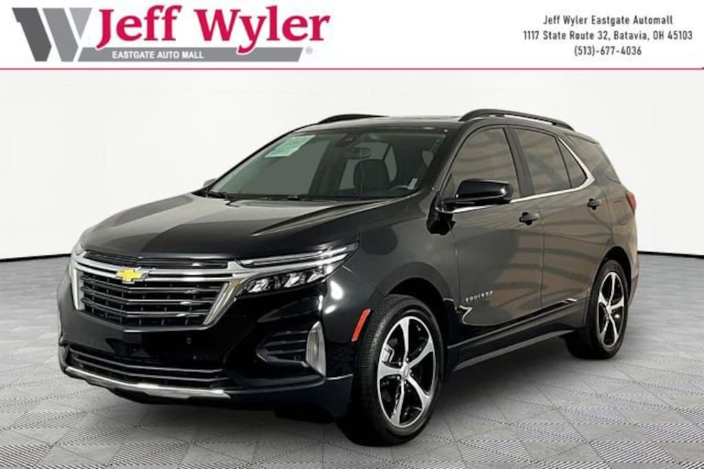 Jeff Wyler Eastgate Auto Mall is pleased to offer this attractive 2023 Chevrolet Equinox LT in Mosaic Black Metallic. Well equipped with: Confidence & Convenience Package, Driver Confidence II Package (Front & Rear Park Assist), Driver Convenience Package (Dual-Zone Automatic Climate Control, Heated Driver & Front Passenger Seats, Rear Power Liftgate, Remote Start, and Wrapped Steering Wheel), Preferred Equipment Group 1LT, Side Blind Zone & Rear Cross Traffic (Lane Change Alert w/Side Blind Zone Alert and Rear Cross Traffic Alert), 17 Aluminum Wheels, 19 Aluminum Wheels, 2 Rear USB Charging-Only Ports, 2 USB Ports & Auxiliary Input Jack, 2-Way Power Driver Lumbar Control Seat Adjuster, 3.50 Final Drive Axle Ratio, 4-Wheel Disc Brakes, 6 Speakers, 6-Speaker Audio System Feature, ABS brakes, Air Conditioning, Alloy wheels, AM/FM radio: SiriusXM, Auto High-beam Headlights, Bluetooth® For Phone, Brake assist, Bumpers: body-color, Compass, Delay-off headlights, Driver 8-Way Power Seat Adjuster, Driver door bin, Driver vanity mirror, Dual front impact airbags, Dual front side impact airbags, Electronic Stability Control, Emergency communication system: OnStar and Chevrolet connected services capable, Four wheel independent suspension, Front anti-roll bar, Front Bucket Seats, Front Center Armrest, Front Passenger 4-Way Manual Seat Adjuster, Front reading lights, Fully automatic headlights, Heated door mirrors, Illuminated entry, Low tire pressure warning, Occupant sensing airbag, Outside temperature display, Overhead airbag, Overhead console, Panic alarm, Passenger door bin, Passenger vanity mirror, Power door mirrors, Power driver seat, Power steering, Power Sunroof, Power windows, Premium audio system: Chevrolet Infotainment 3, Premium Cloth Seat Trim, Radio data system, Radio: Chevrolet Infotainment 3 System w/AM/FM, Rear anti-roll bar, Rear reading lights, Rear seat center armrest, Rear window defroster, Rear window wiper, Remote keyless entry, Roof-Mounted Luggage Rack Side Rails, Security system, SiriusXM Radio, Speed control, Speed-sensing steering, Split folding rear seat, Spoiler, Steering wheel mounted audio controls, Tachometer, Telescoping steering wheel, Tilt steering wheel, Traction control, Trip computer, Variably intermittent wipers, Wheels: 19 Aluminum (LPO), and Wireless Apple CarPlay/Wireless Android Auto. CARFAX One-Owner. Clean CARFAX. Ask about available certifications. Used vehicles 10 years of age or newer with less than 100,000 miles are eligible for the Wyler Assurance Program, but eligible vehicles must pass our reconditioning process and multi-point inspection. Provided the vehicle passes inspection, vehicles will be eligible for the 6 month/6,000 mile limited warranty. The 6 month/6,000 mile limited warranty is NOT available on AS-IS vehicles, wholesale vehicles, lease buyback/pass-thru vehicles or un-inspected vehicles. Note that this program can also apply to vehicles where the remaining factory coverage is less than 6 months or 6,000 miles. Please check the Federal Trade Commission (FTC) Buyers guide on the vehicle for full details as to whether or not warranty coverage may apply. Contact Dealer for additional details. The Wyler Assurance 6 month/6,000 Mile limited warranty ends 6 months from the date of the Retail Purchase Agreement (BUYERS ORDER) or when the vehicle's odometer registers 6,000 additional miles to the mileage listed on the BUYERS ORDER, whichever comes first. Your Deductible - The warranty holder on your contract pays the first $100 of each covered repair.