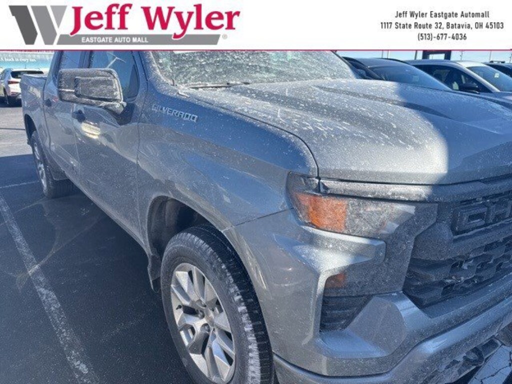 Jeff Wyler Eastgate Auto Mall is delighted to offer this gorgeous 2023 Chevrolet Silverado 1500 Custom in Sterling Gray Metallic. Well equipped with: Cloth Rear Seat w/Storage Package, Custom Convenience Package (Electric Rear-Window Defogger, EZ Lift Power Lock & Release Tailgate, LED Cargo Area Lighting, Remote Vehicle Starter System, and Theft Deterrent System (Unauthorized Entry)), Custom Value Package, High Capacity Suspension Package, Preferred Equipment Group 1CX (10-Way Power Driver Seat w/Lumbar, 120-Volt Bed Mounted Power Outlet, 120-Volt Instrument Panel Power Outlet, 3.5 Monochromatic Display Driver Info Center, Bluetooth® For Phone, Chevrolet Connected Access Capable, Color-Keyed Carpeting Floor Covering, Compass, Deep-Tinted Glass, Dual Rear USB Ports (Charge Only), Electrical Steering Column Lock, Electronic Cruise Control, Front Frame-Mounted Black Recovery Hooks, Front Rubberized Vinyl Floor Mats, HD Rear Vision Camera, Manual Tilt Wheel Steering Column, OnStar & Chevrolet Connected Services Capable, Power Front Windows w/Driver Express Up/Down, Power Front Windows w/Passenger Express Down, Power Rear Windows w/Express Down, Rear 60/40 Folding Bench Seat (Folds Up), Rear Rubberized-Vinyl Floor Mats, Remote Keyless Entry, SiriusXM Radio, Standard Tailgate, Wi-Fi Hot Spot Capable, and Wireless Phone Projection), Trailering Package (Hitch Guidance), 3.42 Rear Axle Ratio, 4-Wheel Disc Brakes, 40/20/40 Front Split-Bench Seat, 6 Speakers, 6-Speaker Audio System, ABS brakes, Air Conditioning, Alloy wheels, AM/FM radio: SiriusXM, Apple CarPlay/Android Auto, Auto High-beam Headlights, Auto-Locking Rear Differential, Automatic Emergency Braking, Brake assist, Bumpers: body-color, Chevytec Spray-On Black Bedliner, Cloth Seat Trim, Delay-off headlights, Driver door bin, Driver vanity mirror, Dual front impact airbags, Dual front side impact airbags, Electronic Stability Control, Following Distance Indicator, Forward Collision Alert, Front anti-roll bar, Front Center Armrest w/Storage, Front License Plate Kit, Front Pedestrian Braking, Front reading lights, Front wheel independent suspension, Fully automatic headlights, Heated door mirrors, Illuminated entry, IntelliBeam Automatic High Beam On/Off, Lane Keep Assist w/Lane Departure Warning, Low tire pressure warning, Not Equipped w/Rear USB Ports, Not Equipped w/Steering Column Lock, Occupant sensing airbag, Outside temperature display, Overhead airbag, Overhead console, Panic alarm, Passenger door bin, Passenger vanity mirror, Power door mirrors, Power driver seat, Power steering, Power windows, Premium audio system: Chevrolet Infotainment 3, Radio data system, Radio: Chevrolet Infotainment 3 System, Rear reading lights, Rear step bumper, Rear window defroster, Remote keyless entry, Security system, Speed control, Speed-sensing steering, Split folding rear seat, Tachometer, Tilt steering wheel, Traction control, Trip computer, Variably intermittent wipers, Voltmeter, and Wheels: 20 x 9 Bright Silver Painted Aluminum. Clean CARFAX. Ask about available certifications. Used vehicles 10 years of age or newer with less than 100,000 miles are eligible for the Wyler Assurance Program, but eligible vehicles must pass our reconditioning process and multi-point inspection. Provided the vehicle passes inspection, vehicles will be eligible for the 6 month/6,000 mile limited warranty. The 6 month/6,000 mile limited warranty is NOT available on AS-IS vehicles, wholesale vehicles, lease buyback/pass-thru vehicles or un-inspected vehicles. Note that this program can also apply to vehicles where the remaining factory coverage is less than 6 months or 6,000 miles. Please check the Federal Trade Commission (FTC) Buyers guide on the vehicle for full details as to whether or not warranty coverage may apply. Contact Dealer for additional details. The Wyler Assurance 6 month/6,000 Mile limited warranty ends 6 months from the date of the Retail Purchase Agreement (BUYERS ORDER) or when the v