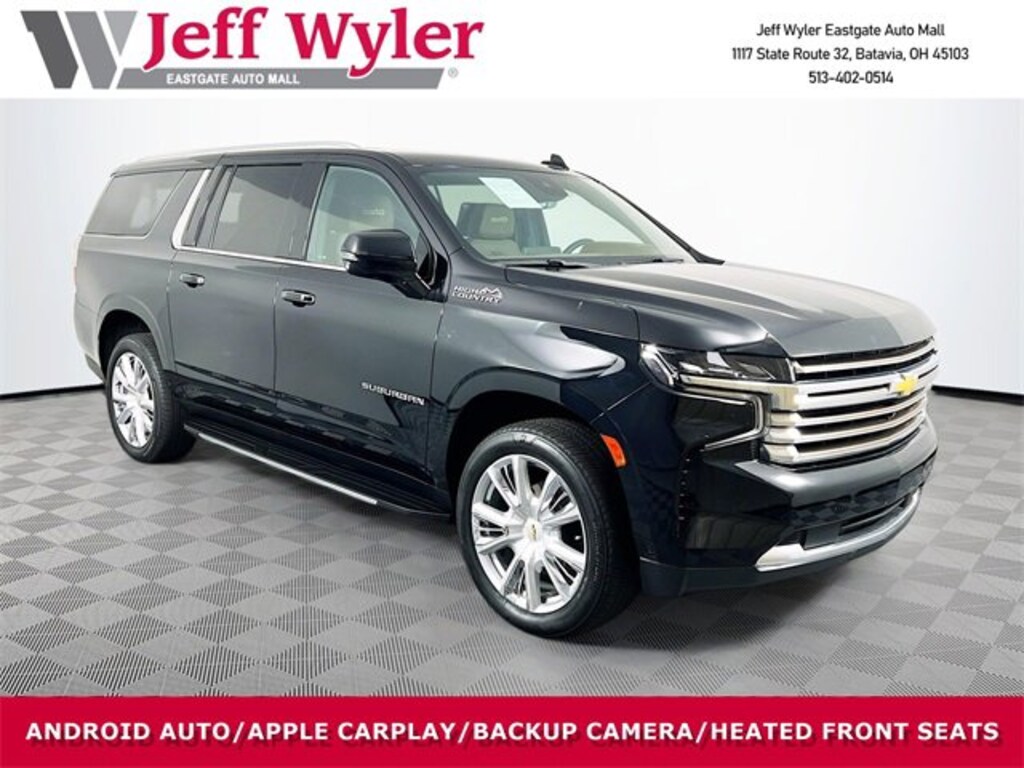 Jeff Wyler Eastgate Auto Mall is pleased to offer this gorgeous 2024 Chevrolet Suburban High Country in Black. Well equipped with: Advanced Technology Package (Enhanced Automatic Parking Assist, Reverse Automatic Braking, and Super Cruise), Advanced Trailering Package (Hitch View w/Pan/Zoom Image Adjustment, Integrated Trailer Brake Controller, Smart Trailer Integration Indicator, and Trailer Side Blind Zone Alert), Max Trailering Package (Extra Capacity Cooling System), Preferred Equipment Group 3LZ (12-Way Power Driver & Passenger Seat Adjusters, 15 Diagonal Multi-Color Head-Up Display, 1st & 2nd Row Color-Keyed Carpeted Floor Mats, 2-Speed Active Electronic AutoTrac Transfer Case, 3rd Row 60/40 Power-Folding Split-Bench, Adaptive Cruise Control, Bose 10-Speaker Surround w/CenterPoint, Bright Front & Rear Door Sill Plates, Chrome Door Handles w/Body-Color Strip, Color-Keyed Carpeting Floor Covering, Driver & Front Outboard Passenger Airbags, Dual Exhaust System, Enhanced Automatic Emergency Braking, Enhanced Driver Information Center, Floor Console, Hands-Free Rear Power Programmable Liftgate, HD Surround Vision, Heated 2nd Row Outboard Seats, Heated Driver & Front Passenger Seats, Heated Steering Wheel, Hill Descent Control, Infotainment Display, Inside Rearview Auto-Dimming Rear Camera Mirror, Lane Change Alert w/Side Blind Zone Alert, LED Daytime Running Lamps, Memory Settings, Outside Heated Power-Adjustable Mirrors, Perforated Heated & Ventilated Seats, Power Release 2nd Row Bucket Seats, Power Tilt & Telescopic Steering Column, Rear Camera Mirror Washer, Rear Cross Traffic Alert, Rear Pedestrian Alert, Remote Start, Safety Alert Seat, SiriusXM w/360L, Universal Home Remote, Wireless Charging, and Wrapped Steering Wheel), 10 Speakers, 1st & 2nd Rows All-Weather Floor Liners (LPO), 3.23 Rear Axle Ratio, 3rd row seats: split-bench, 4-Wheel Disc Brakes, ABS brakes, Adaptive suspension, Air Conditioning, All-Weather Cargo Mat (LPO), Alloy wheels, AM/FM radio: SiriusXM with 360L, Apple CarPlay/Android Auto, Auto High-beam Headlights, Auto-dimming door mirrors, Auto-dimming Rear-View mirror, Auto-leveling suspension, Automatic temperature control, Brake assist, Bumpers: body-color, Compass, Delay-off headlights, Driver door bin, Driver vanity mirror, Dual front impact airbags, Dual front side impact airbags, Electronic Stability Control, Emergency communication system: OnStar and Chevrolet connected services capable, Exterior Parking Camera Rear, Four wheel independent suspension, Front anti-roll bar, Front Bucket Seats, Front Center Armrest, Front dual zone A/C, Front reading lights, Fully automatic headlights, Garage door transmitter, Heads-Up Display, Heated door mirrors, Heated front seats, Heated rear seats, Heated steering wheel, Illuminated entry, Low tire pressure warning, Magnetic Ride Control Suspension, Memory seat, Navigation System, Occupant sensing airbag, Outside temperature display, Overhead airbag, Overhead console, Panic alarm, Passenger door bin, Passenger vanity mirror, Perforated Leather Seating Surfaces, Power door mirrors, Power driver seat, Power Liftgate, Power passenger seat, Power steering, Power windows, Premium audio system: Chevrolet Infotainment 3 Premium, Radio: Chevrolet Infotainment 3 Premium System, Rain sensing wipers, Rear air conditioning, Rear anti-roll bar, Rear reading lights, Rear Seat Media System, Rear window defroster, Rear window wiper, Remote keyless entry, Roof rack: xxxxxx, Security system, Speed control, Speed-sensing steering, Split folding rear seat, Spoiler, Steering wheel memory, Steering wheel mounted audio controls, Tachometer, Telescoping steering wheel, Tilt steering wheel, Traction control, Trip computer, Turn signal indicator mirrors, Variably intermittent wipers, Ventilated front seats, Voltmeter, Wheel Locks (Set of 4) (LPO), and Wheels: 22 x 9 Sterling Silver Premium Painted. CARFAX One-Owner. Clean CARFAX. Ask about available certifications. Used vehicles 10 y
