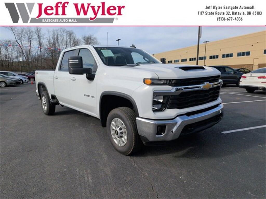 Jeff Wyler Eastgate Auto Mall is pleased to offer this beautiful-looking 2025 Chevrolet Silverado 2500HD LT in Summit White. Well equipped with: Convenience Package (10-Way Power Driver Seat Adjuster with Lumbar, Dual-Zone Automatic Climate Control, Front LED Fog Lamps, LED Cargo Area Lighting, and Manual Tilt and Telescoping Steering Column), Heat Package (Heated Driver and Front Outboard Passenger Seating and Heated Steering Wheel), Preferred Equipment Group 1LT (120-Volt Bed Mounted Power Outlet, 120-Volt Interior Power Outlet, 17 Machined Aluminum Wheels, 170 Amp Alternator, 2-Speed Electronic Shift Transfer Case, 4-Way Manual Driver Seat Adjuster, Black Mirror Caps, Bluetooth® For Phone, Chevrolet Connected Access Capable, Color-Keyed Carpeting Floor Covering, Compass, Deep-Tinted Glass, Durabed Pickup Bed, Electronic Cruise Control with Set and Resume Speed, EZ Lift Power Lock and Release Tailgate, Front Rubberized Vinyl Floor Mats, Halogen Reflector Headlamps, HD Rear Vision Camera, Heated Vertical Trailering Mirrors, Keyless Open and Start, OnStar Services Capable, Power Door Locks, Power Front Windows with Driver Express Up/Down, Power Front Windows with Passenger Express Down, Power Rear Windows with Express Down, Push Button Start, Rear 60/40 Folding Bench Seat (folds Up), Rear Rubberized Vinyl Floor Mats, SiriusXM with 360L Trial Subscription, Standard Tailgate, Steering Wheel Audio Controls, Wi-Fi Hotspot Capable, Wireless Phone Projection, and Wrapped Steering Wheel), Remote Start Package (Electric Rear-Window Defogger, Remote Vehicle Starter System, and Unauthorized Entry Theft-Deterrent System), Suspension Package, 220 Amp Alternator, 4-Wheel Disc Brakes, 6 Speakers, 6-Speaker Audio System, 6 Rectangular Chromed Tubular Assist Steps, 720 Cold-Cranking Amps Heavy-Duty Battery, ABS brakes, Air Conditioning, Alloy wheels, AM/FM radio: SiriusXM with 360L, Apple CarPlay/Android Auto, Auto High-beam Headlights, Brake assist, Bumpers: chrome, Cloth Seat Trim, Delay-off headlights, Driver door bin, Driver vanity mirror, Dual front impact airbags, Dual front side impact airbags, Electronic Stability Control, Emergency communication system: OnStar, Engine Block Heater, Exhaust Brake, Front 40/20/40 Split-Bench Seats with Lockable Storage, Front anti-roll bar, Front Center Armrest w/Storage, Front reading lights, Front wheel independent suspension, Fully automatic headlights, Heated door mirrors, Illuminated entry, Low tire pressure warning, Occupant sensing airbag, Outside temperature display, Overhead airbag, Overhead console, Panic alarm, Passenger door bin, Passenger vanity mirror, Power door mirrors, Power steering, Power windows, Premium audio system: Chevrolet Infotainment 3 Premium, Radio: Chevrolet Infotainment 3 Premium System, Rear reading lights, Rear step bumper, Remote keyless entry, Speed control, Split folding rear seat, Steering wheel mounted audio controls, Tachometer, Tilt steering wheel, Traction control, Trip computer, Turn signal indicator mirrors, Variably intermittent wipers, Voltmeter, and Winter Grille Cover. CARFAX One-Owner. Ask about available certifications. Used vehicles 10 years of age or newer with less than 100,000 miles are eligible for the Wyler Assurance Program, but eligible vehicles must pass our reconditioning process and multi-point inspection. Provided the vehicle passes inspection, vehicles will be eligible for the 6 month/6,000 mile limited warranty. The 6 month/6,000 mile limited warranty is NOT available on AS-IS vehicles, wholesale vehicles, lease buyback/pass-thru vehicles or un-inspected vehicles. Note that this program can also apply to vehicles where the remaining factory coverage is less than 6 months or 6,000 miles. Please check the Federal Trade Commission (FTC) Buyers guide on the vehicle for full details as to whether or not warranty coverage may apply. Contact Dealer for additional details. The Wyler Assurance 6 mont