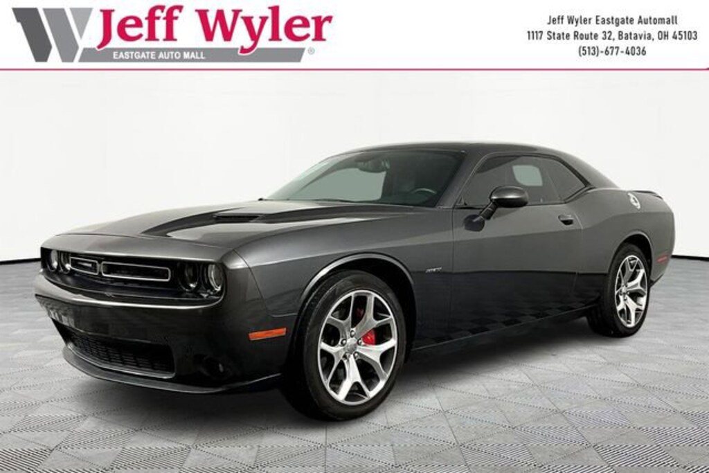 Jeff Wyler Eastgate Auto Mall is delighted to offer this gorgeous 2016 Dodge Challenger R/T in Granite Crystal Metallic Clearcoat. Well equipped with: Driver Convenience Group, Quick Order Package 22D R/T Plus (1-Yr SiriusXM Radio Service, 276 Watt Amplifier, 6 Mo. Trial (Registration Required), 8.4 Touchscreen Display, Bright Pedals, Door Trim Panels w/Ambient Lighting, For More Info, Call 800-643-2112, GPS Antenna Input, Heated Front Seats, Heated Steering Wheel, Hectic Mesh Interior Accents, Instrument Panel Satin Silver Bezel, Leather Trim Seats, Nappa Leather Sport Seat, Nav Capable! See Dealer For Details, ParkSense Rear Park Assist System, ParkView Rear Back-Up Camera, Power Tilt/Telescope Steering Column, Radio: Uconnect 8.4, Rear Bodycolor Spoiler, Shark Fin Antenna, SiriusXM Satellite Radio, Uconnect Access, Universal Garage Door Opener, Ventilated Front Seats, and Wheels: 20 x 8.0 Polished/Painted Aluminum), Sound Group II (506 Watt Amplifier and 9 Amplified Speakers w/Subwoofer), Technology Group, 4-Wheel Disc Brakes, 6 Speakers, ABS brakes, Air Conditioning, Alloy wheels, AM/FM radio, Anti-Lock Brakes, Anti-whiplash front head restraints, Auto-dimming Rear-View mirror, Automatic temperature control, Brake assist, Bumpers: body-color, Compass, Delay-off headlights, Driver door bin, Driver vanity mirror, Dual front impact airbags, Dual front side impact airbags, Electronic Stability Control, Four wheel independent suspension, Front anti-roll bar, Front Bucket Seats, Front Center Armrest, Front dual zone A/C, Front fog lights, Front reading lights, Fully automatic headlights, Heated door mirrors, Houndstooth Cloth Sport Seats, Illuminated entry, Integrated Voice Command w/Bluetooth, Leather Shift Knob, Low tire pressure warning, Media Hub (SD, USB, AUX Ports), Outside temperature display, Overhead airbag, Overhead console, Panic alarm, Passenger door bin, Passenger vanity mirror, Power door mirrors, Power driver seat, Power steering, Power Sunroof, Power windows, Radio data system, Radio: Uconnect 5.0, Radio: Uconnect 8.4 NAV, Rear anti-roll bar, Rear reading lights, Rear seat center armrest, Rear window defroster, Remote keyless entry, Security system, Speed control, Speed-sensing steering, Split folding rear seat, Spoiler, Steering wheel mounted audio controls, Tachometer, Telescoping steering wheel, Tilt steering wheel, Traction control, Trip computer, Variably intermittent wipers, and Wheels: 20 x 8.0 Premium Painted Aluminum. Ask about available certifications. Used vehicles 10 years of age or newer with less than 100,000 miles are eligible for the Wyler Assurance Program, but eligible vehicles must pass our reconditioning process and multi-point inspection. Provided the vehicle passes inspection, vehicles will be eligible for the 6 month/6,000 mile limited warranty. The 6 month/6,000 mile limited warranty is NOT available on AS-IS vehicles, wholesale vehicles, lease buyback/pass-thru vehicles or un-inspected vehicles. Note that this program can also apply to vehicles where the remaining factory coverage is less than 6 months or 6,000 miles. Please check the Federal Trade Commission (FTC) Buyers guide on the vehicle for full details as to whether or not warranty coverage may apply. Contact Dealer for additional details. The Wyler Assurance 6 month/6,000 Mile limited warranty ends 6 months from the date of the Retail Purchase Agreement (BUYERS ORDER) or when the vehicle's odometer registers 6,000 additional miles to the mileage listed on the BUYERS ORDER, whichever comes first. Your Deductible - The warranty holder on your contract pays the first $100 of each covered repair.