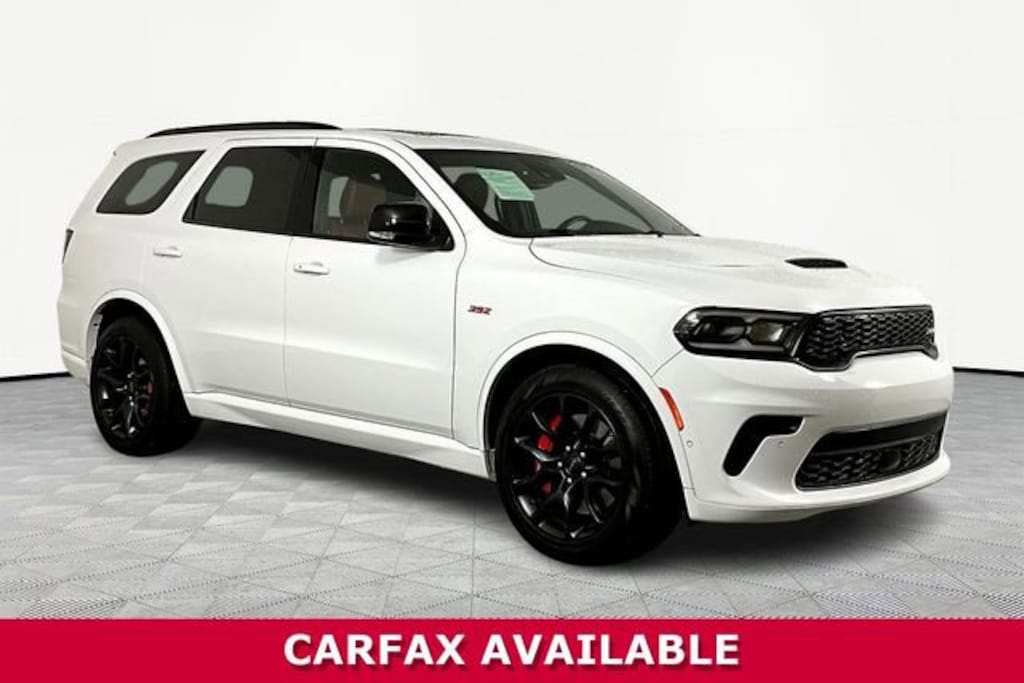 Jeff Wyler Eastgate Auto Mall is honored to offer this gorgeous 2024 Dodge Durango SRT 392 in White Knuckle Clearcoat. Well equipped with: Quick Order Package 29N SRT 392 Premium (1 USB Charging Port in Console, 12V Auxiliary Power Outlet In Console, 19 harman/kardon Amplified Speakers w/Subwoofer, 2 Pc Brembo Front Rotor Brakes, 2nd Row Console w/Armrest & Storage, 3rd Row Floor Mat & Full Console, 7 & 4 Pin Wiring Harness, 825 Watt Amplifier, Adaptive Cruise Control w/Stop, Advanced Brake Assist, Black Roof Rails, Blind Spot w/Trailer Detection, Class IV Receiver Hitch, Forged Carbon Fiber Interior Accents, Full Speed Forward Collision Warning Plus, High Performance Laguna Leather Seats, Illuminated Rear Cupholders, Integrated Roof Rail Crossbars, Lane Departure Warning Plus, Power Sunroof, Premium Instrument Panel, Red Seat Belts, Suede Headliner, and Trailer Brake Control), 2nd Row Mini Console w/Cupholders, 3.70 Rear Axle Ratio, 3rd Row Floor Mat & Mini Console, 3rd row seats: split-bench, 4-Wheel Disc Brakes, 9 Speakers, ABS brakes, Adaptive suspension, Air Conditioning, Alloy wheels, AM/FM radio: SiriusXM w/360L, Apple CarPlay/Android Auto, Audio memory, Auto High-beam Headlights, Auto-dimming door mirrors, Auto-dimming Rear-View mirror, Automatic temperature control, Brake assist, Bumpers: body-color, Compass, Delay-off headlights, Driver door bin, Driver vanity mirror, Dual front impact airbags, Dual front side impact airbags, Electronic Stability Control, Emergency communication system, Four wheel independent suspension, Front anti-roll bar, Front Bucket Seats, Front Center Armrest w/Storage, Front dual zone A/C, Front reading lights, Fully automatic headlights, Garage door transmitter, Gloss Black Exterior Mirrors, Heated door mirrors, Heated front seats, Heated rear seats, Heated steering wheel, Illuminated entry, Knee airbag, Leather Shift Knob, Leather steering wheel, Leather Trimmed Bucket Seats, Low tire pressure warning, Memory seat, Navigation system: TomTom, Occupant sensing airbag, Outside temperature display, Overhead airbag, Overhead console, Panic alarm, ParkView Rear Back-Up Camera, Passenger door bin, Passenger vanity mirror, Power door mirrors, Power driver seat, Power Liftgate, Power passenger seat, Power steering, Power windows, Radio data system, Radio: Uconnect 5 Nav w/10.1 Display, Rain sensing wipers, Rear air conditioning, Rear anti-roll bar, Rear reading lights, Rear window defroster, Rear window wiper, Remote keyless entry, Security system, Speed control, Speed-sensing steering, Speed-Sensitive Wipers, Split folding rear seat, Spoiler, Sport steering wheel, Steering wheel mounted audio controls, Tachometer, Telescoping steering wheel, Tilt steering wheel, Traction control, Trip computer, Turn signal indicator mirrors, Variably intermittent wipers, Ventilated front seats, Voltmeter, and Wheels: 20 x 10 Hyper Black Aluminum. CARFAX One-Owner. Clean CARFAX. Ask about available certifications. Used vehicles 10 years of age or newer with less than 100,000 miles are eligible for the Wyler Assurance Program, but eligible vehicles must pass our reconditioning process and multi-point inspection. Provided the vehicle passes inspection, vehicles will be eligible for the 6 month/6,000 mile limited warranty. The 6 month/6,000 mile limited warranty is NOT available on AS-IS vehicles, wholesale vehicles, lease buyback/pass-thru vehicles or un-inspected vehicles. Note that this program can also apply to vehicles where the remaining factory coverage is less than 6 months or 6,000 miles. Please check the Federal Trade Commission (FTC) Buyers guide on the vehicle for full details as to whether or not warranty coverage may apply. Contact Dealer for additional details. The Wyler Assurance 6 month/6,000 Mile limited warranty ends 6 months from the date of the Retail Purchase Agreement (BUYERS ORDER) or when the vehicle's odometer registers 6,000 additional miles to