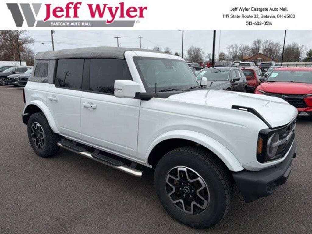 Jeff Wyler Eastgate Auto Mall is honored to offer this handsome 2022 Ford Bronco Outer Banks in Oxford White. Well equipped with: Equipment Group 314A Lux Package (12 LCD Capacitive Touchscreen w/Swipe Capability, 2 Smart Charging USB Ports In Dashboard, 360-Degree Camera, Adaptive Cruise Control, Additional Sound Deadening, Connected Built-In Navigation, Evasive Steering Assist, Front Parking Sensors, Heated Steering Wheel, Information on Demand Panel, Radio: B&O Sound System by Bang & Olufsen, Sideview Mirrors, Universal Garage Door Opener, and Wireless Charging Pad), 18 Bright Machined Aluminum Wheels, 4-Wheel Disc Brakes, 4.27 Axle Ratio, 6 Speakers, ABS brakes, Air Conditioning, Alloy wheels, AM/FM radio: SiriusXM with 360L, AM/FM Stereo, Auto High-beam Headlights, Auto-dimming Rear-View mirror, Automatic temperature control, Auxiliary Switches, Brake assist, Compass, Connected Navigation, Delay-off headlights, Driver door bin, Driver vanity mirror, Dual front impact airbags, Dual front side impact airbags, Electronic Stability Control, Emergency communication system: 911 Assist, Exterior Parking Camera Rear, Front & Rear Floor Liners, Front anti-roll bar, Front Bucket Seats, Front Center Armrest, Front dual zone A/C, Front fog lights, Front reading lights, Front wheel independent suspension, Fully automatic headlights, Heated Cloth Bucket Seats, Heated door mirrors, Heated front seats, Illuminated entry, Integrated roll-over protection, Keyless Entry Keypad, Leather Shift Knob, Low tire pressure warning, Navigation system: Connected Navigation, Occupant sensing airbag, Outside temperature display, Overhead airbag, Overhead console, Paint Protection Film (DISC), Panic alarm, Passenger door bin, Passenger vanity mirror, Power door mirrors, Power steering, Power windows, Radio data system, Remote keyless entry, Security system, SiriusXM Radio w/360L, Speed control, Split folding rear seat, Steering wheel mounted audio controls, SYNC 4, Tachometer, Telescoping steering wheel, Tilt steering wheel, Towing Capability, Traction control, Trip computer, Variably intermittent wipers, and Voltmeter. CARFAX One-Owner. Awards:* NACTOY 2022 North American Utility of the Year Ask about available certifications. Used vehicles 10 years of age or newer with less than 100,000 miles are eligible for the Wyler Assurance Program, but eligible vehicles must pass our reconditioning process and multi-point inspection. Provided the vehicle passes inspection, vehicles will be eligible for the 6 month/6,000 mile limited warranty. The 6 month/6,000 mile limited warranty is NOT available on AS-IS vehicles, wholesale vehicles, lease buyback/pass-thru vehicles or un-inspected vehicles. Note that this program can also apply to vehicles where the remaining factory coverage is less than 6 months or 6,000 miles. Please check the Federal Trade Commission (FTC) Buyers guide on the vehicle for full details as to whether or not warranty coverage may apply. Contact Dealer for additional details. The Wyler Assurance 6 month/6,000 Mile limited warranty ends 6 months from the date of the Retail Purchase Agreement (BUYERS ORDER) or when the vehicle's odometer registers 6,000 additional miles to the mileage listed on the BUYERS ORDER, whichever comes first. Your Deductible - The warranty holder on your contract pays the first $100 of each covered repair.