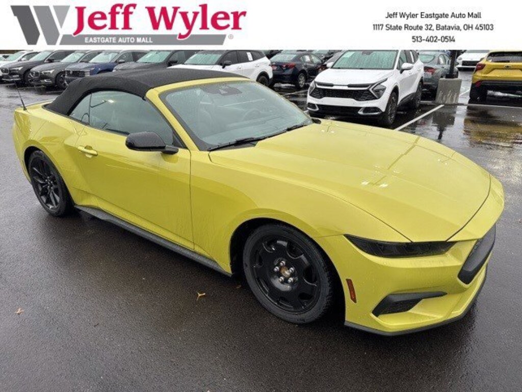 Jeff Wyler Eastgate Auto Mall is delighted to offer this attractive 2025 Ford Mustang EcoBoost Premium in Yellow. Well equipped with: Security Package (Active Anti-Theft System, Locking Center Console, and Wheel Locking Kit), ABS brakes, Alloy wheels, Compass, Electronic Stability Control, Front dual zone A/C, Heated door mirrors, Heated front seats, Illuminated entry, Low tire pressure warning, Remote keyless entry, Traction control, 4-Wheel Disc Brakes, 9 Speakers, ActiveX Bucket Seats, Air Conditioning, AM/FM radio: SiriusXM with 360L, AM/FM Stereo, Auto High-beam Headlights, Auto-dimming Rear-View mirror, Automatic temperature control, Brake assist, Bumpers: body-color, Climate Controlled Heated/Cooled Front Seats, Convertible roof lining, Delay-off headlights, Driver door bin, Driver vanity mirror, Dual front impact airbags, Dual front side impact airbags, Emergency communication system: 911 Assist, Exterior Parking Camera Rear, Four wheel independent suspension, Front anti-roll bar, Front Bucket Seats, Front Center Armrest, Front reading lights, Fully automatic headlights, Glass rear window, HD Radio, Heated steering wheel, Knee airbag, Leather Shift Knob, Leather steering wheel, Occupant sensing airbag, Outside temperature display, Overhead console, Panic alarm, Passenger door bin, Passenger vanity mirror, Power convertible roof, Power door mirrors, Power driver seat, Power passenger seat, Power steering, Power windows, Radio data system, Rain sensing wipers, Rear anti-roll bar, Rear Parking Sensors, Rear window defroster, Security system, SiriusXM w/360L, Speed control, Speed-sensing steering, Speed-Sensitive Wipers, Spoiler, Sport steering wheel, Steering wheel mounted audio controls, SYNC 4, Tachometer, Telescoping steering wheel, Tilt steering wheel, Trip computer, Turn signal indicator mirrors, Variably intermittent wipers, Ventilated front seats, Voltmeter, and Wheels: 18 x 8 Machined-Face Aluminum. CARFAX One-Owner. Clean CARFAX. Ask about available certifications. Used vehicles 10 years of age or newer with less than 100,000 miles are eligible for the Wyler Assurance Program, but eligible vehicles must pass our reconditioning process and multi-point inspection. Provided the vehicle passes inspection, vehicles will be eligible for the 6 month/6,000 mile limited warranty. The 6 month/6,000 mile limited warranty is NOT available on AS-IS vehicles, wholesale vehicles, lease buyback/pass-thru vehicles or un-inspected vehicles. Note that this program can also apply to vehicles where the remaining factory coverage is less than 6 months or 6,000 miles. Please check the Federal Trade Commission (FTC) Buyers guide on the vehicle for full details as to whether or not warranty coverage may apply. Contact Dealer for additional details. The Wyler Assurance 6 month/6,000 Mile limited warranty ends 6 months from the date of the Retail Purchase Agreement (BUYERS ORDER) or when the vehicle's odometer registers 6,000 additional miles to the mileage listed on the BUYERS ORDER, whichever comes first. Your Deductible - The warranty holder on your contract pays the first $100 of each covered repair.