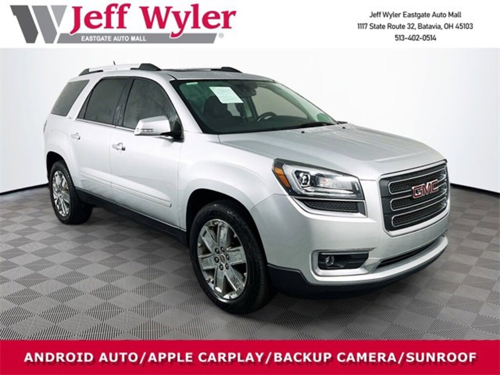 Jeff Wyler Eastgate Auto Mall is proud to offer this superb-looking 2017 GMC Acadia Limited Limited in Quicksilver Metallic. Well equipped with: Preferred Equipment Group 4SB (2-Position Memory For Driver's Seat Adjuster, 8-Way Power Driver Seat w/Memory, 8-Way Power Passenger Seat Adjuster, Body-Color Bodyside Moldings, Bose Premium 10-Speaker Audio System, Electronic Cruise Control w/Set & Resume Speed, Front Halogen Projector Beam Fog Lamps, Heated Leather Wrapped Steering Wheel, Heated Power-Adjustable Outside Mirrors, Inside Rear-View Auto-Dimming Mirror, Leather-Wrapped Steering Wheel, Power Rear Liftgate Body, Power Windows w/Driver Express-Up & -Down, Rear Audio System Controls, Remote Vehicle Start, Side Blind Zone Alert & Rear Cross Traffic Alert, Single Outlet Exhaust, Steering Wheel Mounted Audio Controls, Tilt & Telescopic Steering Column, Tri-Zone Automatic Climate Control, Universal Home Remote, and Variable Effort Power Steering), Trailering Equipment (Heavy-Duty Cooling System and Trailer Hitch), 10 Speakers, 3.16 Axle Ratio, 3rd row seats: split-bench, 4-Wheel Disc Brakes, 7-Passenger Seating (2-2-3 Seating Configuration), ABS brakes, Air Conditioning, Alloy wheels, AM/FM radio: SiriusXM, Auto-dimming door mirrors, Auto-dimming Rear-View mirror, Automatic temperature control, Bodyside moldings, Brake assist, Bumpers: body-color, CD player, Compass, Delay-off headlights, Driver door bin, Driver vanity mirror, Dual front impact airbags, Dual front side impact airbags, Dual SkyScape 2-Panel Power Sunroof, Electronic Stability Control, Emergency communication system: OnStar Guidance, Exterior Parking Camera Rear, Four wheel independent suspension, Front anti-roll bar, Front Bucket Seats, Front Center Armrest w/Storage, Front dual zone A/C, Front fog lights, Front reading lights, Fully automatic headlights, Garage door transmitter, Heads-Up Display, Heated door mirrors, Heated Driver & Front Passenger Seats, Heated front seats, Heated steering wheel, High-Intensity Discharge Headlights, Illuminated entry, Leather Shift Knob, Leather-Appointed Seat Trim, Low tire pressure warning, Memory seat, Navigation System, NavTraffic, Occupant sensing airbag, Outside temperature display, Overhead airbag, Overhead console, Panic alarm, Passenger door bin, Passenger vanity mirror, Power door mirrors, Power driver seat, Power Liftgate, Power passenger seat, Power steering, Power windows, Radio data system, Radio: Color Touch Navigation w/IntelliLink, Rear air conditioning, Rear anti-roll bar, Rear audio controls, Rear Parking Sensors, Rear reading lights, Rear window defroster, Rear window wiper, Remote keyless entry, Roof rack: rails only, Security system, SiriusXM Satellite Radio, Speed control, Speed-sensing steering, Spoiler, Steering wheel mounted audio controls, Tachometer, Telescoping steering wheel, Tilt steering wheel, Traction control, Trip computer, Turn signal indicator mirrors, Variably intermittent wipers, Voltmeter, and Wheels: 20 x 7.5 Chrome-Clad Aluminum (4) Reviews:* Ride quality is smooth and compliant over most road surfaces; plenty of cargo capacity, even with the third row in place; seating for up to eight passengers; top crash test scores. Source: EdmundsAwards:* 2017 KBB.com Brand Image Awards Ask about available certifications. Used vehicles 10 years of age or newer with less than 100,000 miles are eligible for the Wyler Assurance Program, but eligible vehicles must pass our reconditioning process and multi-point inspection. Provided the vehicle passes inspection, vehicles will be eligible for the 6 month/6,000 mile limited warranty. The 6 month/6,000 mile limited warranty is NOT available on AS-IS vehicles, wholesale vehicles, lease buyback/pass-thru vehicles or un-inspected vehicles. Note that this program can also apply to vehicles where the remaining factory coverage is less than 6 months or 6,000 miles. Please check the Federal Trade Commission (FTC) Buyers guide on the vehicle fo
