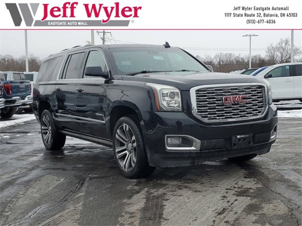 Jeff Wyler Eastgate Auto Mall is pleased to offer this fantastic 2019 GMC Yukon XL Denali in Onyx Black. Well equipped with: Advanced Adaptive Cruise Control (4-Wheel Disc & 4-Wheel VAC Power Antilock Brakes and Forward Automatic Braking), Denali Ultimate Package (Pwr Retractable Assist Steps w/Perimeter Lighting), Enhanced Driver Alert Package (Forward Collision Alert, IntelliBeam Automatic High Beam On/Off, Lane Keep Assist w/Lane Departure Warning, and Low Speed Forward Automatic Braking), Enhanced Security Package (Theft-Deterrent Alarm System, Vehicle Inclination Sensor, and Vehicle Interior Movement Sensor), License Plate Front Mounting Package, Magnetic Ride Control Suspension Package, Memory Package, Open Road Package (3rd Row DVD Screen, Power Tilt-Sliding Sunroof w/Express-Open/Close, and Rear Seat Blu-Ray/DVD Entertainment System), Preferred Equipment Group 5SA (4-Wheel Antilock Disc Brakes, 5 Auxiliary 12-volt Power Outlets, Black Assist Steps w/Chrome Strip, Bose Active Noise Cancellation, Hands Free Power Programmable Rear Liftgate, Heated Leather-Wrapped Steering Wheel, Inside Rear-View Auto-Dimming Mirror, Integrated Trailer Brake Controller, Lane Change Alert w/Side Blind Zone Alert, Passive Entry System, Power Release 2nd Row Bucket Seats, Power Tilt & Telescopic Steering Column, Power-Adjustable Pedals For Accelerator & Brake, Push Button Keyless Start, Rear Cross Traffic Alert, Remote Keyless Entry, Universal Home Remote, and Wireless Charging), 10 Speakers, 1st & 2nd Rows All-Weather Floor Liner (LPO), 3.23 Rear Axle Ratio, 3rd row seats: split-bench, 4-Wheel Disc Brakes, ABS brakes, Adaptive suspension, Adjustable pedals, Air Conditioning, Alloy wheels, AM/FM radio: SiriusXM, Apple CarPlay/Android Auto, Auto High-beam Headlights, Auto-dimming door mirrors, Auto-dimming Rear-View mirror, Automatic temperature control, Bodyside moldings, Bose Centerpoint Surround Sound Audio System, Brake assist, Bumpers: body-color, CD Player, CD player, Compass, Delay-off headlights, Driver door bin, Driver vanity mirror, Dual front impact airbags, Dual front side impact airbags, Electronic Stability Control, Emergency communication system: OnStar and GMC connected services capable, Exterior Parking Camera Rear, Front anti-roll bar, Front Bucket Seats, Front Center Armrest, Front dual zone A/C, Front fog lights, Front reading lights, Front wheel independent suspension, Full-Feature Reclining Bucket Seats, Fully automatic headlights, Garage door transmitter, Genuine wood console insert, Genuine wood dashboard insert, Genuine wood door panel insert, Heads-Up Display, Heated & Ventilated Driver & Front Passenger Seats, Heated door mirrors, Heated front seats, Heated rear seats, Heated steering wheel, High-Intensity Discharge Headlights, Illuminated entry, Leather Shift Knob, Low tire pressure warning, Memory seat, Navigation System, Occupant sensing airbag, Outside temperature display, Overhead airbag, Overhead console, Panic alarm, Passenger door bin, Passenger vanity mirror, Pedal memory, Perforated Leather-Appointed Seat Trim, Power door mirrors, Power driver seat, Power Liftgate, Power passenger seat, Power steering, Power windows, Premium audio system: IntelliLink, Radio: AM/FM/SiriusXM w/Navigation, Rain sensing wipers, Rear air conditioning, Rear anti-roll bar, Rear reading lights, Rear window defroster, Rear window wiper, Remote keyless entry, Roof rack: rails only, Security system, SiriusXM NavTraffic, SiriusXM Radio, Speed control, Speed-sensing steering, Split folding rear seat, Spoiler, Steering wheel memory, Steering wheel mounted audio controls, Tachometer, Telescoping steering wheel, Tilt steering wheel, Traction control, Trip computer, Turn signal indicator mirrors, Variably intermittent wipers, Ventilated front seats, Voltmeter, Wheels: 20 x 9 Bright Machined Aluminum, and Wheels: 22 x 8.5 Bright Aluminum. Ask about available certifications. Used vehicles 10 years of age or newer with less than 100,000 m