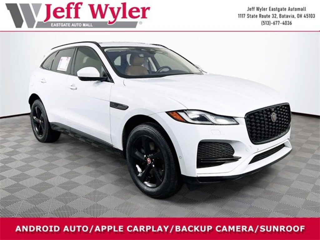 Jeff Wyler Eastgate Auto Mall is very proud to offer this outstanding-looking 2021 Jaguar F-PACE P250 S in White. Well equipped with: 11 Speakers, 4-Wheel Disc Brakes, ABS brakes, Adaptive suspension, Air Conditioning, Alloy wheels, AM/FM radio: SiriusXM, Apple CarPlay/Android Auto, Auto High-beam Headlights, Auto-dimming door mirrors, Auto-dimming Rear-View mirror, Automatic temperature control, Axle Ratio: 3.73, Brake assist, Bumpers: body-color, Compass, Delay-off headlights, Driver door bin, Driver vanity mirror, Dual front impact airbags, Dual front side impact airbags, Electronic Stability Control, Emergency communication system: Remote SOS Emergency Call, Four wheel independent suspension, Front anti-roll bar, Front Bucket Seats, Front Center Armrest, Front dual zone A/C, Front reading lights, Fully automatic headlights, Garage door transmitter: HomeLink, Genuine wood dashboard insert, Genuine wood door panel insert, Grained Leather Seat Trim, Heated door mirrors, Heated Front Bucket Seats, Heated front seats, Illuminated entry, Leather Shift Knob, Leather steering wheel, Low tire pressure warning, Navigation system: InControl Navigation Pro, Occupant sensing airbag, Outside temperature display, Overhead airbag, Overhead console, Panic alarm, Passenger door bin, Passenger vanity mirror, Power door mirrors, Power driver seat, Power Liftgate, Power moonroof, Power passenger seat, Power steering, Power windows, Radio data system, Radio: Meridian 380W Sound System, Rain sensing wipers, Rear anti-roll bar, Rear fog lights, Rear reading lights, Rear seat center armrest, Rear window defroster, Rear window wiper, Remote keyless entry, Security system, Speed control, Speed-sensing steering, Split folding rear seat, Spoiler, Steering wheel mounted audio controls, Tachometer, Telescoping steering wheel, Tilt steering wheel, Traction control, Trip computer, Turn signal indicator mirrors, Variably intermittent wipers, Wheels: 19 5 Split-Spoke Gloss Grey (Style 5038), and Wheels: 19 5 Spoke Gloss Black (Style 5103) Ask about available certifications. Used vehicles 10 years of age or newer with less than 100,000 miles are eligible for the Wyler Assurance Program, but eligible vehicles must pass our reconditioning process and multi-point inspection. Provided the vehicle passes inspection, vehicles will be eligible for the 6 month/6,000 mile limited warranty. The 6 month/6,000 mile limited warranty is NOT available on AS-IS vehicles, wholesale vehicles, lease buyback/pass-thru vehicles or un-inspected vehicles. Note that this program can also apply to vehicles where the remaining factory coverage is less than 6 months or 6,000 miles. Please check the Federal Trade Commission (FTC) Buyers guide on the vehicle for full details as to whether or not warranty coverage may apply. Contact Dealer for additional details. The Wyler Assurance 6 month/6,000 Mile limited warranty ends 6 months from the date of the Retail Purchase Agreement (BUYERS ORDER) or when the vehicle's odometer registers 6,000 additional miles to the mileage listed on the BUYERS ORDER, whichever comes first. Your Deductible - The warranty holder on your contract pays the first $100 of each covered repair.
