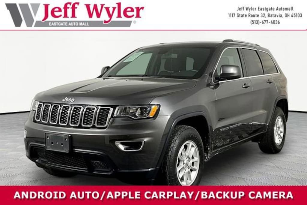 Jeff Wyler Eastgate Auto Mall is proud to offer this wonderful 2019 Jeep Grand Cherokee Laredo E in Granite Crystal Metallic Clearcoat. Well equipped with: Quick Order Package 2BE Laredo E (Bright Side Roof Rails, Power 4-Way Driver Lumbar Adjust, and Power 8-Way Driver/Manual Passenger Seat), Trailer Tow Group IV (180 Amp Alternator, 7 & 4 Pin Wiring Harness, Class IV Receiver Hitch, Heavy-Duty Engine Cooling, and Rear Load Leveling Suspension), 3.45 Rear Axle Ratio, 4-Wheel Disc Brakes, 6 Speakers, ABS brakes, Air Conditioning, Alloy wheels, AM/FM radio, Anti-whiplash front head restraints, Apple CarPlay, Apple CarPlay/Android Auto, Automatic temperature control, Brake assist, Bumpers: body-color, Cloth Bucket Seats, Compass, Delay-off headlights, Driver door bin, Driver vanity mirror, Dual front impact airbags, Dual front side impact airbags, Electronic Stability Control, Four wheel independent suspension, Front anti-roll bar, Front Bucket Seats, Front Center Armrest w/Storage, Front dual zone A/C, Front fog lights, Front reading lights, Fully automatic headlights, Google Android Auto, Heated door mirrors, Illuminated entry, Integrated Voice Command w/Bluetooth, Knee airbag, Leather Shift Knob, Low tire pressure warning, Normal Duty Suspension, Occupant sensing airbag, Outside temperature display, Overhead airbag, Overhead console, Panic alarm, ParkView Rear Back-Up Camera, Passenger door bin, Passenger vanity mirror, Power door mirrors, Power steering, Power windows, Radio data system, Radio: Uconnect 4 w/7 Display, Rear anti-roll bar, Rear reading lights, Rear seat center armrest, Rear window defroster, Rear window wiper, Remote keyless entry, Speed control, Speed-sensing steering, Speed-Sensitive Wipers, Split folding rear seat, Spoiler, Steering Wheel Mounted Audio Controls, Steering wheel mounted audio controls, Tachometer, Telescoping steering wheel, Tilt steering wheel, Traction control, Trip computer, Variably intermittent wipers, and Wheels: 17 x 8.0 Silver Aluminum. CARFAX One-Owner. Clean CARFAX. Ask about available certifications. Used vehicles 10 years of age or newer with less than 100,000 miles are eligible for the Wyler Assurance Program, but eligible vehicles must pass our reconditioning process and multi-point inspection. Provided the vehicle passes inspection, vehicles will be eligible for the 6 month/6,000 mile limited warranty. The 6 month/6,000 mile limited warranty is NOT available on AS-IS vehicles, wholesale vehicles, lease buyback/pass-thru vehicles or un-inspected vehicles. Note that this program can also apply to vehicles where the remaining factory coverage is less than 6 months or 6,000 miles. Please check the Federal Trade Commission (FTC) Buyers guide on the vehicle for full details as to whether or not warranty coverage may apply. Contact Dealer for additional details. The Wyler Assurance 6 month/6,000 Mile limited warranty ends 6 months from the date of the Retail Purchase Agreement (BUYERS ORDER) or when the vehicle's odometer registers 6,000 additional miles to the mileage listed on the BUYERS ORDER, whichever comes first. Your Deductible - The warranty holder on your contract pays the first $100 of each covered repair.