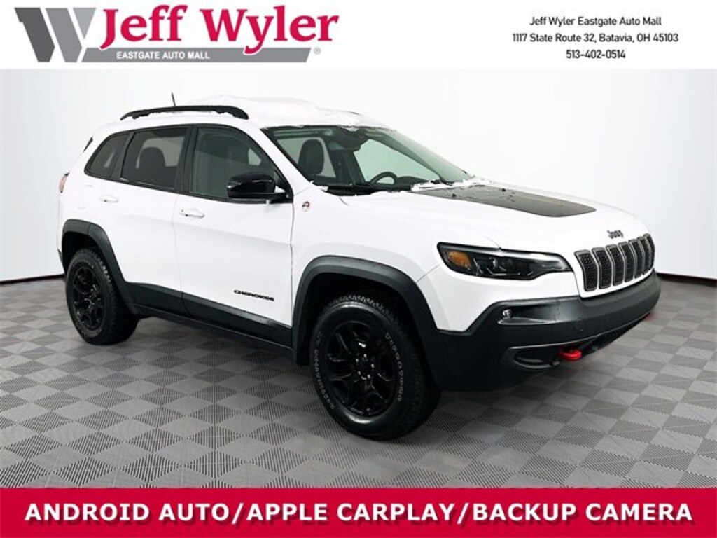 Jeff Wyler Eastgate Auto Mall is proud to offer this great 2022 Jeep Cherokee Trailhawk in Bright White Clearcoat. Well equipped with: Quick Order Package 27E, Trailer Tow Group (7 & 4 Pin Wiring Harness, Class III Receiver Hitch, and Trailer Tow Wiring Harness), 3.517 Final Drive Ratio, 4-Wheel Disc Brakes, 4G LTE Wi-Fi Hot Spot, 6 Speakers, 8.4 Touchscreen Display, ABS brakes, Air Conditioning, Alloy wheels, AM/FM radio: SiriusXM, Anti-whiplash front head restraints, Apple CarPlay, Apple CarPlay/Android Auto, Automatic temperature control, Brake assist, Cloth/Premium Vinyl Bucket Seats, Compass, Delay-off headlights, Driver door bin, Driver vanity mirror, Dual front impact airbags, Dual front side impact airbags, Electronic Stability Control, For Details, Visit DriveUconnect.com, For More Info, Call 800-643-2112, Four wheel independent suspension, Front anti-roll bar, Front Bucket Seats, Front Center Armrest, Front dual zone A/C, Front fog lights, Front License Plate Bracket, Front reading lights, Fully automatic headlights, Google Android Auto, GPS Antenna Input, Heated door mirrors, Heated front seats, Heated steering wheel, Illuminated entry, K-Black Door Trim Panel Appliques, K-Black Interior Accents, Knee airbag, Leather Shift Knob, Low tire pressure warning, Occupant sensing airbag, Off Road Suspension, Outside temperature display, Overhead airbag, Overhead console, Panic alarm, ParkView Rear Back-Up Camera, Passenger door bin, Passenger vanity mirror, Power door mirrors, Power driver seat, Power steering, Power windows, Radio data system, Radio: Uconnect 4 w/8.4 Display, Rain sensing wipers, Rear anti-roll bar, Rear reading lights, Rear seat center armrest, Rear side impact airbag, Rear window defroster, Rear window wiper, Remote keyless entry, Roof rack: rails only, SiriusXM Radio Service, SiriusXM Satellite Radio, Speed control, Speed-sensing steering, Split folding rear seat, Spoiler, Steering wheel mounted audio controls, Tachometer, Telescoping steering wheel, Tilt steering wheel, Traction control, Trip computer, Turn signal indicator mirrors, USB Host Flip, Variably intermittent wipers, Voltmeter, Wheels: 17 x 7.5 Black Painted Aluminum, and Wheels: 17 x 7.5 Painted Diamond Cut AluminuM. CARFAX One-Owner. Ask about available certifications. Used vehicles 10 years of age or newer with less than 100,000 miles are eligible for the Wyler Assurance Program, but eligible vehicles must pass our reconditioning process and multi-point inspection. Provided the vehicle passes inspection, vehicles will be eligible for the 6 month/6,000 mile limited warranty. The 6 month/6,000 mile limited warranty is NOT available on AS-IS vehicles, wholesale vehicles, lease buyback/pass-thru vehicles or un-inspected vehicles. Note that this program can also apply to vehicles where the remaining factory coverage is less than 6 months or 6,000 miles. Please check the Federal Trade Commission (FTC) Buyers guide on the vehicle for full details as to whether or not warranty coverage may apply. Contact Dealer for additional details. The Wyler Assurance 6 month/6,000 Mile limited warranty ends 6 months from the date of the Retail Purchase Agreement (BUYERS ORDER) or when the vehicle's odometer registers 6,000 additional miles to the mileage listed on the BUYERS ORDER, whichever comes first. Your Deductible - The warranty holder on your contract pays the first $100 of each covered repair.