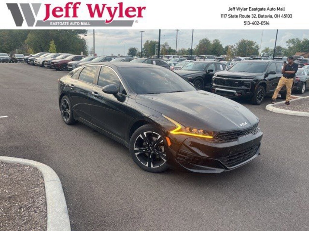 Jeff Wyler Eastgate Auto Mall is very proud to offer this fantastic 2022 Kia K5 GT-Line in Ebony Black. Well equipped with: 4-Wheel Disc Brakes, 6 Speakers, ABS brakes, Air Conditioning, Alloy wheels, AM/FM radio: SiriusXM, Apple CarPlay & Android Auto, Auto High-beam Headlights, Automatic temperature control, Brake assist, Bumpers: body-color, Carpeted Floor Mats, Cloth/Leatherette Seat Trim, Delay-off headlights, Driver door bin, Driver vanity mirror, Dual front impact airbags, Dual front side impact airbags, Electronic Stability Control, Four wheel independent suspension, Front anti-roll bar, Front Bucket Seats, Front Center Armrest, Front dual zone A/C, Front fog lights, Front reading lights, Fully automatic headlights, Heated door mirrors, Heated Front Bucket Seats, Heated front seats, Illuminated entry, Knee airbag, Low tire pressure warning, Navigation System, Occupant sensing airbag, Outside temperature display, Overhead airbag, Overhead console, Panic alarm, Passenger door bin, Passenger vanity mirror, Power door mirrors, Power driver seat, Power steering, Power windows, Radio data system, Radio: AM/FM/MP3 Audio System, Rear anti-roll bar, Rear seat center armrest, Rear side impact airbag, Rear window defroster, Remote keyless entry, Security system, Speed control, Speed-sensing steering, Split folding rear seat, Spoiler, Sport steering wheel, Steering wheel mounted audio controls, Tachometer, Telescoping steering wheel, Tilt steering wheel, Traction control, Trip computer, Turn signal indicator mirrors, Variably intermittent wipers, and Wheels: 7.5J x 18 Gloss Black Machined Finish Alloy. Ask about available certifications. Used vehicles 10 years of age or newer with less than 100,000 miles are eligible for the Wyler Assurance Program, but eligible vehicles must pass our reconditioning process and multi-point inspection. Provided the vehicle passes inspection, vehicles will be eligible for the 6 month/6,000 mile limited warranty. The 6 month/6,000 mile limited warranty is NOT available on AS-IS vehicles, wholesale vehicles, lease buyback/pass-thru vehicles or un-inspected vehicles. Note that this program can also apply to vehicles where the remaining factory coverage is less than 6 months or 6,000 miles. Please check the Federal Trade Commission (FTC) Buyers guide on the vehicle for full details as to whether or not warranty coverage may apply. Contact Dealer for additional details. The Wyler Assurance 6 month/6,000 Mile limited warranty ends 6 months from the date of the Retail Purchase Agreement (BUYERS ORDER) or when the vehicle's odometer registers 6,000 additional miles to the mileage listed on the BUYERS ORDER, whichever comes first. Your Deductible - The warranty holder on your contract pays the first $100 of each covered repair.