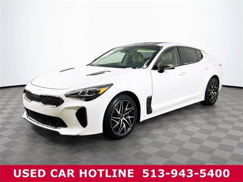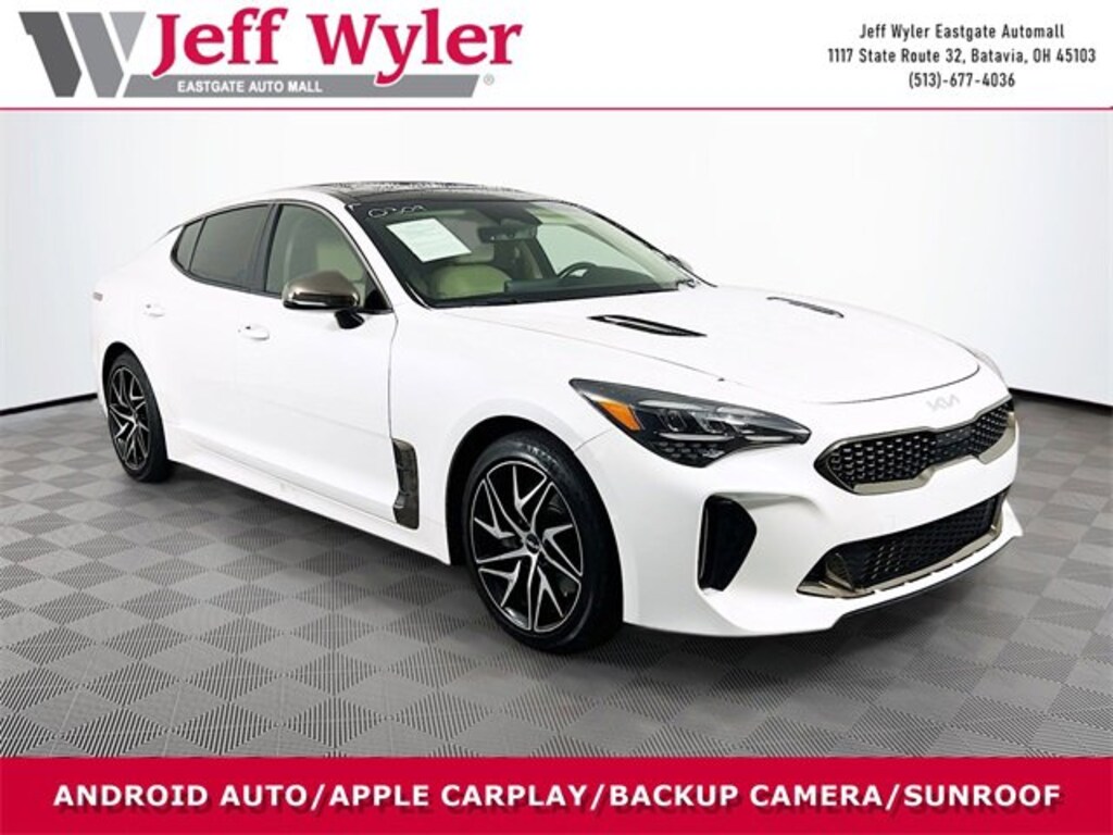 Jeff Wyler Eastgate Auto Mall is excited to offer this gorgeous 2023 Kia Stinger GT-Line in Snow White Pearl. Well equipped with: Sun & Sound Package (8-Way Power Adjustable Passenger Seat, Power Tilt & Slide Sunroof w/One-Touch, and Radio: harmon/kardon AM/FM/MP3/HD Audio System), 4-Wheel Disc Brakes, 9 Speakers, ABS brakes, Air Conditioning, Alloy wheels, AM/FM radio: SiriusXM, Anti-whiplash front head restraints, Apple CarPlay & Android Auto, Auto High-beam Headlights, Auto-dimming Rear-View mirror, Automatic temperature control, Brake assist, Bumpers: body-color, Carpeted Floor Mat, Delay-off headlights, Driver door bin, Driver vanity mirror, Dual front impact airbags, Dual front side impact airbags, Electronic Stability Control, Emergency communication system, Exterior Parking Camera Rear, Four wheel independent suspension, Front anti-roll bar, Front Bucket Seats, Front Center Armrest, Front dual zone A/C, Front reading lights, Fully automatic headlights, Heated door mirrors, Heated Front Bucket Seats, Heated front seats, Heated steering wheel, Illuminated entry, Knee airbag, Leather Seat Trim, Low tire pressure warning, Navigation System, Occupant sensing airbag, Outside temperature display, Overhead airbag, Overhead console, Panic alarm, Passenger door bin, Passenger vanity mirror, Power door mirrors, Power driver seat, Power steering, Power windows, Radio: AM/FM/MP3/HD Audio System, Rain sensing wipers, Rear air conditioning, Rear anti-roll bar, Rear seat center armrest, Rear window defroster, Remote keyless entry, Security system, Smart Key w/ Push Button and Remote Start, Speed control, Speed-Sensitive Wipers, Split folding rear seat, Sport steering wheel, Steering wheel mounted audio controls, Tachometer, Telescoping steering wheel, Tilt steering wheel, Traction control, Trip computer, Turn signal indicator mirrors, Variably intermittent wipers, and Wheels: 8.0J x 18 Vertex Alloy. CARFAX One-Owner. Ask about available certifications. Used vehicles 10 years of age or newer with less than 100,000 miles are eligible for the Wyler Assurance Program, but eligible vehicles must pass our reconditioning process and multi-point inspection. Provided the vehicle passes inspection, vehicles will be eligible for the 6 month/6,000 mile limited warranty. The 6 month/6,000 mile limited warranty is NOT available on AS-IS vehicles, wholesale vehicles, lease buyback/pass-thru vehicles or un-inspected vehicles. Note that this program can also apply to vehicles where the remaining factory coverage is less than 6 months or 6,000 miles. Please check the Federal Trade Commission (FTC) Buyers guide on the vehicle for full details as to whether or not warranty coverage may apply. Contact Dealer for additional details. The Wyler Assurance 6 month/6,000 Mile limited warranty ends 6 months from the date of the Retail Purchase Agreement (BUYERS ORDER) or when the vehicle's odometer registers 6,000 additional miles to the mileage listed on the BUYERS ORDER, whichever comes first. Your Deductible - The warranty holder on your contract pays the first $100 of each covered repair.