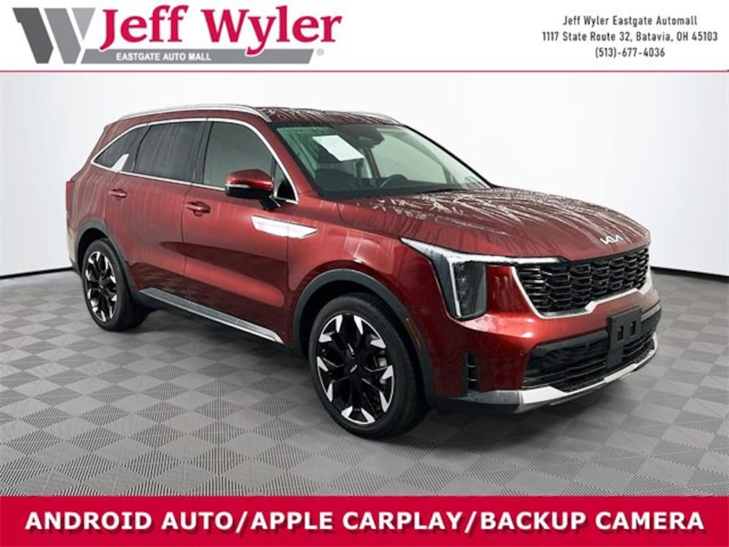 Jeff Wyler Eastgate Auto Mall is pumped up to offer this attractive 2024 Kia Sorento EX in Dawning Red. Well equipped with: 3.316 Axle Ratio, 3rd row seats: split-bench, 4-Wheel Disc Brakes, 6 Speakers, ABS brakes, Air Conditioning, Alloy wheels, AM/FM radio: SiriusXM, Apple CarPlay & Android Auto, Auto High-beam Headlights, Auto-dimming Rear-View mirror, Automatic temperature control, Brake assist, Bumpers: body-color, Carpeted Floor Mats, Delay-off headlights, Driver door bin, Driver vanity mirror, Dual front impact airbags, Dual front side impact airbags, Electronic Stability Control, Emergency communication system: 911 Connect, Exterior Parking Camera Rear, Four wheel independent suspension, Front anti-roll bar, Front Bucket Seats, Front Center Armrest, Front dual zone A/C, Front fog lights, Front reading lights, Fully automatic headlights, Heated door mirrors, Heated Front Bucket Seats, Heated front seats, Illuminated entry, Knee airbag, Leather Shift Knob, Leather steering wheel, Low tire pressure warning, Navigation System, Occupant sensing airbag, Outside temperature display, Overhead airbag, Overhead console, Panic alarm, Passenger door bin, Passenger vanity mirror, Power door mirrors, Power driver seat, Power Liftgate, Power passenger seat, Power steering, Power windows, Radio data system, Radio: AM/FM Audio System, Rear anti-roll bar, Rear reading lights, Rear side impact airbag, Rear window defroster, Rear window wiper, Remote keyless entry, Security system, Smart Key w/ Push Button and Remote Start, Speed control, Speed-sensing steering, Split folding rear seat, Spoiler, Steering wheel mounted audio controls, SynTex Artificial Leather Seat Trim, Tachometer, Telescoping steering wheel, Tilt steering wheel, Traction control, Trip computer, Turn signal indicator mirrors, Variably intermittent wipers, and Wheels: 8.5J x 20 Gloss Black Alloy. CARFAX One-Owner. Ask about available certifications. Used vehicles 10 years of age or newer with less than 100,000 miles are eligible for the Wyler Assurance Program, but eligible vehicles must pass our reconditioning process and multi-point inspection. Provided the vehicle passes inspection, vehicles will be eligible for the 6 month/6,000 mile limited warranty. The 6 month/6,000 mile limited warranty is NOT available on AS-IS vehicles, wholesale vehicles, lease buyback/pass-thru vehicles or un-inspected vehicles. Note that this program can also apply to vehicles where the remaining factory coverage is less than 6 months or 6,000 miles. Please check the Federal Trade Commission (FTC) Buyers guide on the vehicle for full details as to whether or not warranty coverage may apply. Contact Dealer for additional details. The Wyler Assurance 6 month/6,000 Mile limited warranty ends 6 months from the date of the Retail Purchase Agreement (BUYERS ORDER) or when the vehicle's odometer registers 6,000 additional miles to the mileage listed on the BUYERS ORDER, whichever comes first. Your Deductible - The warranty holder on your contract pays the first $100 of each covered repair.