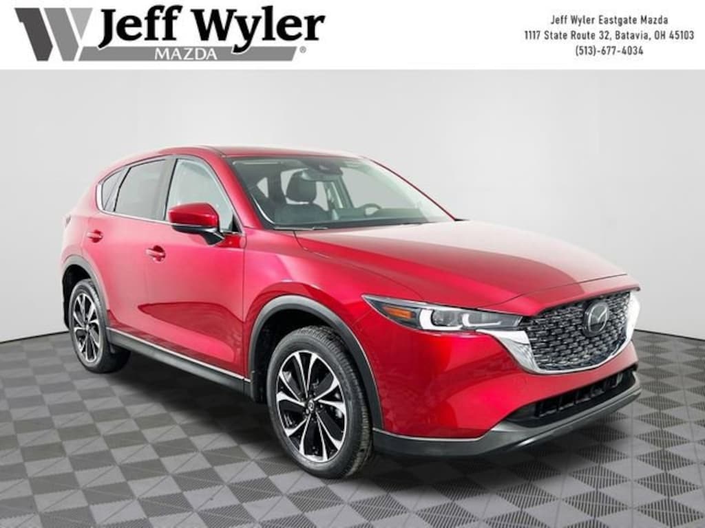 Jeff Wyler Eastgate Auto Mall is pleased to offer this great-looking 2023 Mazda CX-5 2.5 S Premium Package in Soul Red Crystal Metallic. Well equipped with: 10 Speakers, 4-Wheel Disc Brakes, 4.624 Axle Ratio, ABS brakes, Air Conditioning, Alloy wheels, AM/FM radio: SiriusXM, AppLink/Apple CarPlay and Android Auto, Auto High-beam Headlights, Auto-dimming Rear-View mirror, Automatic temperature control, Brake assist, Bumpers: body-color, Cargo Mat, Delay-off headlights, Driver door bin, Driver vanity mirror, Dual front impact airbags, Dual front side impact airbags, E911 Automatic Emergency Notification, Electronic Stability Control, Emergency communication system: MAZDA CONNECT, Exterior Parking Camera Rear, Four wheel independent suspension, Front & Rear Splash Guards, Front anti-roll bar, Front Bucket Seats, Front Center Armrest w/Storage, Front dual zone A/C, Front reading lights, Fully automatic headlights, Garage door transmitter: HomeLink, Heated door mirrors, Heated Front Bucket Seats, Heated front seats, Illuminated entry, Infotainment System Voice Command, Leather Seat Trim, Leather Shift Knob, Low tire pressure warning, Memory seat, Multifunction Commander Control, Occupant sensing airbag, Outside temperature display, Overhead airbag, Overhead console, Pandora, Panic alarm, Passenger door bin, Passenger vanity mirror, Power door mirrors, Power driver seat, Power Liftgate, Power moonroof, Power passenger seat, Power steering, Power windows, Radio Broadcast Data System Program Information, Radio data system, Radio: AM/FM/HD Audio System, Rain sensing wipers, Rear anti-roll bar, Rear reading lights, Rear seat center armrest, Rear window defroster, Rear window wiper, Remote keyless entry, SMS Text Msg Audio Delivery & Reply, Soul Red Crystal Metallic Paint, Speed control, Speed-sensing steering, Split folding rear seat, Spoiler, Steering wheel mounted audio controls, Tachometer, Telescoping steering wheel, Tilt steering wheel, Traction control, Trip computer, Turn signal indicator mirrors, Variably intermittent wipers, Wheel Locks, and Wheels: 19 x 7J Aluminum Alloy. CARFAX One-Owner. Clean CARFAX. Ask about available certifications. Used vehicles 10 years of age or newer with less than 100,000 miles are eligible for the Wyler Assurance Program, but eligible vehicles must pass our reconditioning process and multi-point inspection. Provided the vehicle passes inspection, vehicles will be eligible for the 6 month/6,000 mile limited warranty. The 6 month/6,000 mile limited warranty is NOT available on AS-IS vehicles, wholesale vehicles, lease buyback/pass-thru vehicles or un-inspected vehicles. Note that this program can also apply to vehicles where the remaining factory coverage is less than 6 months or 6,000 miles. Please check the Federal Trade Commission (FTC) Buyers guide on the vehicle for full details as to whether or not warranty coverage may apply. Contact Dealer for additional details. The Wyler Assurance 6 month/6,000 Mile limited warranty ends 6 months from the date of the Retail Purchase Agreement (BUYERS ORDER) or when the vehicle's odometer registers 6,000 additional miles to the mileage listed on the BUYERS ORDER, whichever comes first. Your Deductible - The warranty holder on your contract pays the first $100 of each covered repair.
