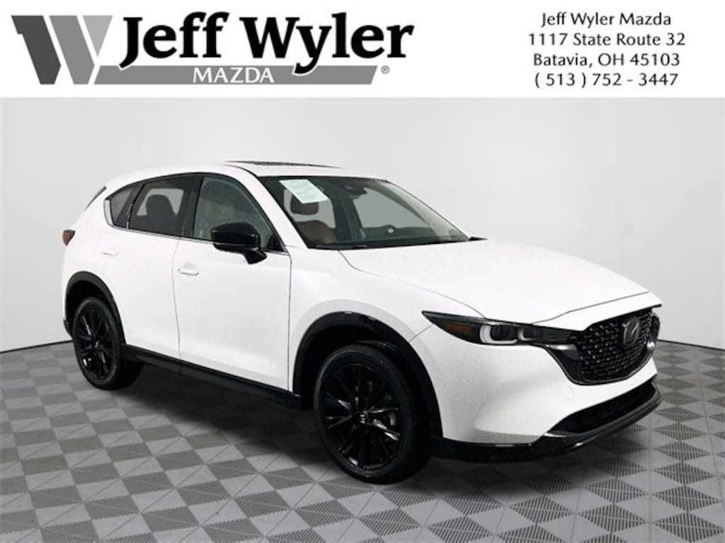 Jeff Wyler Eastgate Auto Mall is pumped up to offer this stunning 2024 Mazda CX-5 2.5 Carbon Turbo in Rhodium White Metallic. Well equipped with: 10 Speakers, 4-Wheel Disc Brakes, 4.411 Axle Ratio, ABS brakes, Air Conditioning, Alloy wheels, AM/FM radio: SiriusXM, AppLink/Apple CarPlay and Android Auto, Auto High-beam Headlights, Auto-dimming Rear-View mirror, Automatic temperature control, Black Lug Nuts & Black Wheel Locks, Brake assist, Bumpers: body-color, Delay-off headlights, Driver door bin, Driver vanity mirror, Dual front impact airbags, Dual front side impact airbags, E911 Automatic Emergency Notification, Electronic Stability Control, Emergency communication system: MAZDA CONNECT, Exterior Parking Camera Rear, Four wheel independent suspension, Front anti-roll bar, Front Bucket Seats, Front Center Armrest w/Storage, Front dual zone A/C, Front reading lights, Fully automatic headlights, Garage door transmitter: HomeLink, Heads-Up Display, Heated door mirrors, Heated front seats, Heated/Ventilated Front Bucket Seats, Illuminated entry, Infotainment System Voice Command, Leather Shift Knob, Leather steering wheel, Low tire pressure warning, Memory seat, Multifunction Commander Control, Occupant sensing airbag, Outside temperature display, Overhead airbag, Overhead console, Pandora, Panic alarm, Passenger door bin, Passenger vanity mirror, Power door mirrors, Power driver seat, Power Liftgate, Power moonroof, Power passenger seat, Power steering, Power windows, Radio Broadcast Data System Program Information, Radio data system, Radio: AM/FM/HD Audio System, Rain sensing wipers, Rear anti-roll bar, Rear reading lights, Rear seat center armrest, Rear window defroster, Rear window wiper, Remote keyless entry, Rhodium White Metallic Paint, Roof Rack Side Rails, SMS Text Msg Audio Delivery & Reply, Speed control, Speed-sensing steering, Split folding rear seat, Spoiler, Steering wheel mounted audio controls, Tachometer, Telescoping steering wheel, Terracotta Leather Seat Trim, Tilt steering wheel, Traction control, Trip computer, Turn signal indicator mirrors, Variably intermittent wipers, Ventilated front seats, and Wheels: 19 x 7J Aluminum Alloy. CARFAX One-Owner. Clean CARFAX. Ask about available certifications. Used vehicles 10 years of age or newer with less than 100,000 miles are eligible for the Wyler Assurance Program, but eligible vehicles must pass our reconditioning process and multi-point inspection. Provided the vehicle passes inspection, vehicles will be eligible for the 6 month/6,000 mile limited warranty. The 6 month/6,000 mile limited warranty is NOT available on AS-IS vehicles, wholesale vehicles, lease buyback/pass-thru vehicles or un-inspected vehicles. Note that this program can also apply to vehicles where the remaining factory coverage is less than 6 months or 6,000 miles. Please check the Federal Trade Commission (FTC) Buyers guide on the vehicle for full details as to whether or not warranty coverage may apply. Contact Dealer for additional details. The Wyler Assurance 6 month/6,000 Mile limited warranty ends 6 months from the date of the Retail Purchase Agreement (BUYERS ORDER) or when the vehicle's odometer registers 6,000 additional miles to the mileage listed on the BUYERS ORDER, whichever comes first. Your Deductible - The warranty holder on your contract pays the first $100 of each covered repair.