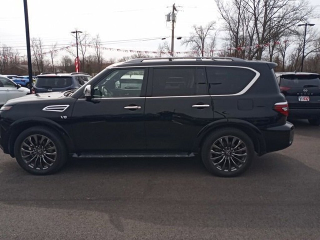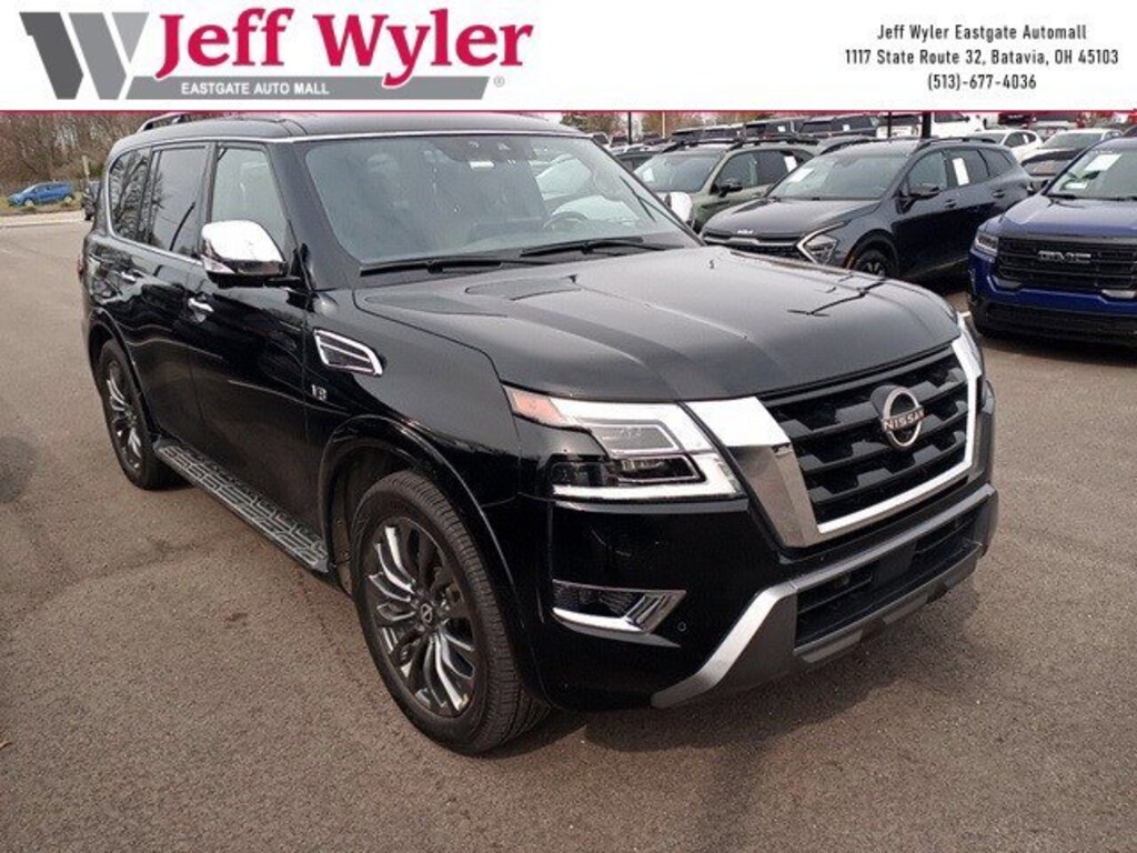 Jeff Wyler Eastgate Auto Mall is excited to offer this great-looking 2021 Nissan Armada Platinum in Super Black. Well equipped with: 13 Speakers, 2.94 Axle Ratio, 3rd Row Carpeted Floor Mats - Bench Seat, 3rd row seats: split-bench, 4-Wheel Disc Brakes, A/V remote, ABS brakes, Air Conditioning, Alloy wheels, AM/FM radio: SiriusXM, Anti-whiplash front head restraints, Auto High-beam Headlights, Auto tilt-away steering wheel, Auto-dimming door mirrors, Auto-dimming Rear-View mirror, Auto-leveling suspension, Automatic temperature control, Brake assist, Bumpers: body-color, Climate-Controlled Front Bucket Seats, Cross Bars, Delay-off headlights, Driver door bin, Driver vanity mirror, Dual front impact airbags, Dual front side impact airbags, Electronic Stability Control, Emergency communication system: NissanConnect Services, Exterior Parking Camera Rear, Four wheel independent suspension, Front anti-roll bar, Front Bucket Seats, Front Center Armrest, Front dual zone A/C, Front fog lights, Front reading lights, Fully automatic headlights, Garage door transmitter: HomeLink, Headphones, Heated door mirrors, Heated front seats, Heated rear seats, Heated steering wheel, Illuminated entry, Leather Shift Knob, Low tire pressure warning, Memory seat, Navigation System, NissanConnect featuring Apple CarPlay and Android Auto, Occupant sensing airbag, Outside temperature display, Overhead airbag, Overhead console, Panic alarm, Passenger door bin, Passenger vanity mirror, Power door mirrors, Power driver seat, Power Liftgate, Power moonroof, Power passenger seat, Power steering, Power windows, Quilted Leather Seat Trim, Radio: NissanConnect w/SiriusXM, Rain sensing wipers, Rear air conditioning, Rear anti-roll bar, Rear reading lights, Rear seat center armrest, Rear window defroster, Rear window wiper, Reclining 3rd row seat, Remote keyless entry, Security system, Speed control, Speed-sensing steering, Speed-Sensitive Wipers, Split folding rear seat, Spoiler, Steering wheel memory, Steering wheel mounted audio controls, Tachometer, Telescoping steering wheel, Tilt steering wheel, Traction control, Trip computer, Turn signal indicator mirrors, Variably intermittent wipers, Ventilated front seats, Voltmeter, and Wheels: 22 Machine-Faced w/Tinted Clear Coat. Clean CARFAX. Ask about available certifications. Used vehicles 10 years of age or newer with less than 100,000 miles are eligible for the Wyler Assurance Program, but eligible vehicles must pass our reconditioning process and multi-point inspection. Provided the vehicle passes inspection, vehicles will be eligible for the 6 month/6,000 mile limited warranty. The 6 month/6,000 mile limited warranty is NOT available on AS-IS vehicles, wholesale vehicles, lease buyback/pass-thru vehicles or un-inspected vehicles. Note that this program can also apply to vehicles where the remaining factory coverage is less than 6 months or 6,000 miles. Please check the Federal Trade Commission (FTC) Buyers guide on the vehicle for full details as to whether or not warranty coverage may apply. Contact Dealer for additional details. The Wyler Assurance 6 month/6,000 Mile limited warranty ends 6 months from the date of the Retail Purchase Agreement (BUYERS ORDER) or when the vehicle's odometer registers 6,000 additional miles to the mileage listed on the BUYERS ORDER, whichever comes first. Your Deductible - The warranty holder on your contract pays the first $100 of each covered repair.