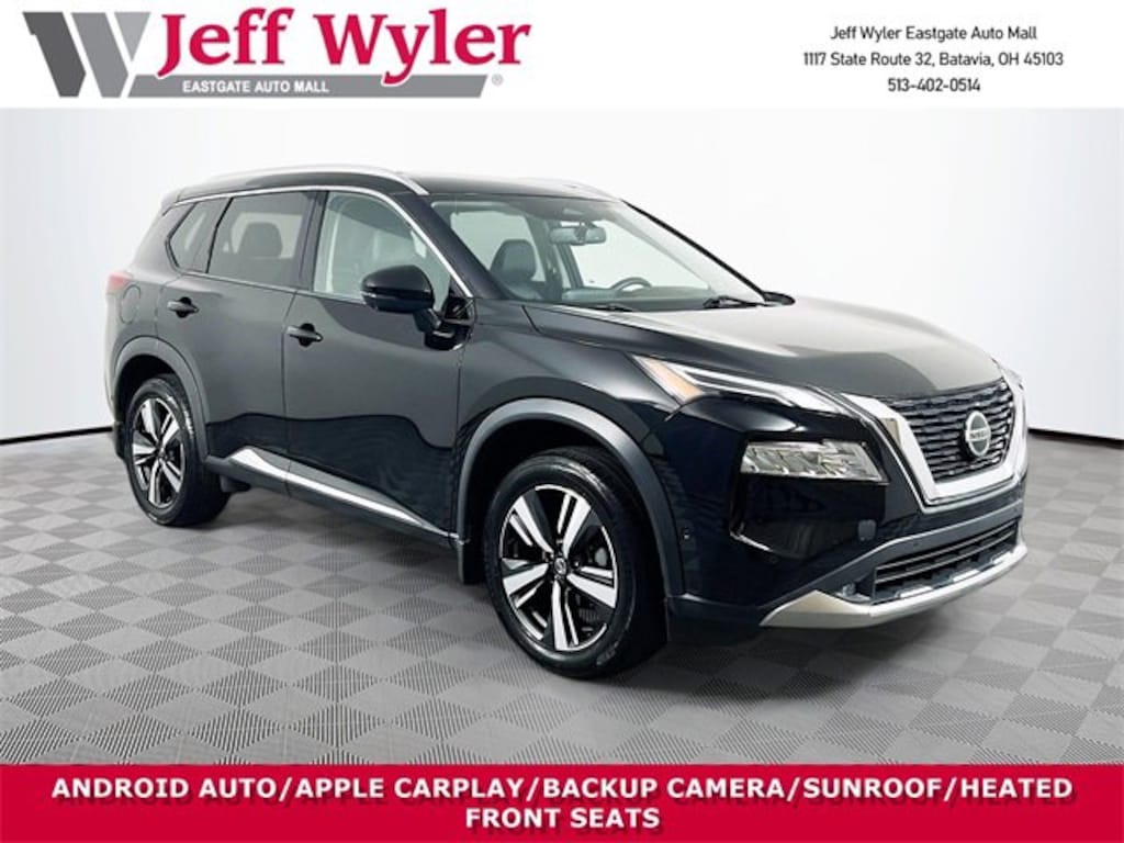 Jeff Wyler Eastgate Auto Mall is delighted to offer this wonderful-looking 2021 Nissan Rogue Platinum in Super Black. Well equipped with: 10 Speakers, 19 Aluminum Alloy Wheels, 4-Wheel Disc Brakes, 5.604 Axle Ratio, ABS brakes, Air Conditioning, Alloy wheels, AM/FM radio, Auto High-beam Headlights, Auto-dimming Rear-View mirror, Automatic temperature control, Black Splash Guards (Set of 4), Bose Premium Audio System, Brake assist, Bumpers: body-color, Chrome Rear Bumper Protector, Delay-off headlights, Driver door bin, Driver vanity mirror, Dual front impact airbags, Dual front side impact airbags, Electronic Stability Control, Emergency communication system: NissanConnect Services, Exterior Parking Camera Rear, First Aid Kit, Floor Mats w/2-Piece Cargo Area Protector, Four wheel independent suspension, Front anti-roll bar, Front Bucket Seats, Front Center Armrest, Front dual zone A/C, Front fog lights, Front reading lights, Fully automatic headlights, Heads-Up Display, Heated door mirrors, Heated Front Bucket Seats, Heated front seats, Heated rear seats, Heated steering wheel, Illuminated entry, Illuminated Kick Plates, Knee airbag, Leather steering wheel, Low tire pressure warning, Memory seat, Navigation system: NissanConnect Navigation, NissanConnect featuring Apple CarPlay and Android Auto, Occupant sensing airbag, Outside temperature display, Overhead airbag, Overhead console, Panic alarm, Passenger door bin, Passenger vanity mirror, Power door mirrors, Power driver seat, Power Liftgate, Power moonroof, Power passenger seat, Power steering, Power windows, Quilted Semi-Aniline Leather Seat Trim, Radio data system, Radio: AM/FM NissanConnect w/Navigation, Rear air conditioning, Rear anti-roll bar, Rear seat center armrest, Rear side impact airbag, Rear window defroster, Rear window wiper, Remote keyless entry, Roof rack: rails only, Security system, Speed control, Speed-Sensitive Wipers, Split folding rear seat, Spoiler, Steering wheel mounted audio controls, Tachometer, Telescoping steering wheel, Tilt steering wheel, Traction control, Trip computer, Turn signal indicator mirrors, and Variably intermittent wipers. CARFAX One-Owner. Ask about available certifications. Used vehicles 10 years of age or newer with less than 100,000 miles are eligible for the Wyler Assurance Program, but eligible vehicles must pass our reconditioning process and multi-point inspection. Provided the vehicle passes inspection, vehicles will be eligible for the 6 month/6,000 mile limited warranty. The 6 month/6,000 mile limited warranty is NOT available on AS-IS vehicles, wholesale vehicles, lease buyback/pass-thru vehicles or un-inspected vehicles. Note that this program can also apply to vehicles where the remaining factory coverage is less than 6 months or 6,000 miles. Please check the Federal Trade Commission (FTC) Buyers guide on the vehicle for full details as to whether or not warranty coverage may apply. Contact Dealer for additional details. The Wyler Assurance 6 month/6,000 Mile limited warranty ends 6 months from the date of the Retail Purchase Agreement (BUYERS ORDER) or when the vehicle's odometer registers 6,000 additional miles to the mileage listed on the BUYERS ORDER, whichever comes first. Your Deductible - The warranty holder on your contract pays the first $100 of each covered repair.