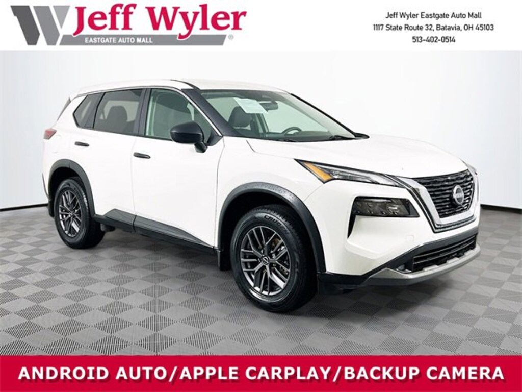 Jeff Wyler Eastgate Auto Mall is very proud to offer this good-looking 2023 Nissan Rogue S in Glacier White. Well equipped with: 17 Aluminum Alloy Wheels, 4 Speakers, 4-Wheel Disc Brakes, 5.604 Axle Ratio, ABS brakes, Air Conditioning, Alloy wheels, AM/FM Radio, AM/FM radio: SiriusXM, Auto High-beam Headlights, Black Splash Guards (Set of 4), Blind Spot Warning, Brake assist, Bumpers: body-color, Cloth Seat Trim, Delay-off headlights, Driver door bin, Driver vanity mirror, Dual front impact airbags, Dual front side impact airbags, Electronic Stability Control, First Aid Kit, Floor Mats w/1-Piece Cargo Area Protector, Four wheel independent suspension, Front anti-roll bar, Front Bucket Seats, Front Center Armrest, Front reading lights, Fully automatic headlights, Illuminated entry, Knee airbag, Low tire pressure warning, NissanConnect featuring Apple CarPlay and Android Auto, Occupant sensing airbag, Outside temperature display, Overhead airbag, Overhead console, Panic alarm, Passenger door bin, Passenger vanity mirror, Power door mirrors, Power steering, Power windows, Radio data system, Rear anti-roll bar, Rear Parking Sensors, Rear seat center armrest, Rear side impact airbag, Rear window defroster, Rear window wiper, Remote keyless entry, Speed control, Speed-Sensitive Wipers, Split folding rear seat, Spoiler, Steering wheel mounted audio controls, Tachometer, Telescoping steering wheel, Tilt steering wheel, Traction control, Trip computer, and Variably intermittent wipers. CARFAX One-Owner. Ask about available certifications. Used vehicles 10 years of age or newer with less than 100,000 miles are eligible for the Wyler Assurance Program, but eligible vehicles must pass our reconditioning process and multi-point inspection. Provided the vehicle passes inspection, vehicles will be eligible for the 6 month/6,000 mile limited warranty. The 6 month/6,000 mile limited warranty is NOT available on AS-IS vehicles, wholesale vehicles, lease buyback/pass-thru vehicles or un-inspected vehicles. Note that this program can also apply to vehicles where the remaining factory coverage is less than 6 months or 6,000 miles. Please check the Federal Trade Commission (FTC) Buyers guide on the vehicle for full details as to whether or not warranty coverage may apply. Contact Dealer for additional details. The Wyler Assurance 6 month/6,000 Mile limited warranty ends 6 months from the date of the Retail Purchase Agreement (BUYERS ORDER) or when the vehicle's odometer registers 6,000 additional miles to the mileage listed on the BUYERS ORDER, whichever comes first. Your Deductible - The warranty holder on your contract pays the first $100 of each covered repair.