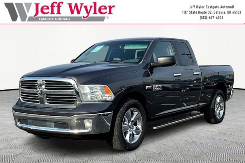Jeff Wyler Eastgate Auto Mall is very proud to offer this handsome 2015 Ram 1500 Big Horn in Granite Crystal Metallic Clearcoat. Well equipped with: Big Horn Regional Package, Quick Order Package 26Z Big Horn (20 x 8 Chrome Clad Aluminum Wheels, 40/20/40 Split Bench Seat, Big Horn Badge, Bright/Bright Billets Grille, Class IV Receiver Hitch, Electric Shift-On-Demand Transfer Case, Fog Lamps, Front Armrest w/Three Cupholders, Front Center Seat Cushion Storage, Leather Wrapped Steering Wheel, Premium Cloth 40/20/40 Bench Seat, and Steering Wheel Mounted Audio Controls), 17 x 7 Aluminum Wheels, 26 Gallon Fuel Tank, 3.21 Rear Axle Ratio, 4-Wheel Disc Brakes, 6 Speakers, ABS brakes, Active Grille Shutters, Air Conditioning, Alloy wheels, AM/FM radio, Black Exterior Mirrors, Brake assist, Bumpers: chrome, Center Hub, Charge Only Remote USB Port, Cloth 40/20/40 Bench Seat, Compass, Delay-off headlights, Driver door bin, Dual front impact airbags, Dual front side impact airbags, Electronic Shift, Electronic Stability Control, Exterior Mirrors w/Heating Element, Front anti-roll bar, Front Center Armrest w/Storage, Front reading lights, Front wheel independent suspension, Fully automatic headlights, GPS Antenna Input, Heated door mirrors, Illuminated entry, Integrated Voice Command w/Bluetooth, Low tire pressure warning, Occupant sensing airbag, Outside temperature display, Overhead airbag, Overhead console, Panic alarm, Passenger door bin, Passenger vanity mirror, Power door mirrors, Power steering, Power windows, Radio data system, Radio: Uconnect 5.0 AM/FM/BT, Rear anti-roll bar, Rear step bumper, Remote keyless entry, SIRIUSXM Satellite Radio, Speed control, Tachometer, Tilt steering wheel, Tip Start, Traction control, Trip computer, Variably intermittent wipers, and Voltmeter. Clean CARFAX. Awards:* 2015 KBB.com Best Buy Awards Finalist * Green Car Journal 2015 Green Truck of the Year * 2015 KBB.com 15 Best Family CarsBased on 2017 EPA mileage ratings. Use for comparison purposes only. Your mileage will vary depending on how you drive and maintain your vehicle, driving conditions and other factors. Ask about available certifications. Used vehicles 10 years of age or newer with less than 100,000 miles are eligible for the Wyler Assurance Program, but eligible vehicles must pass our reconditioning process and multi-point inspection. Provided the vehicle passes inspection, vehicles will be eligible for the 6 month/6,000 mile limited warranty. The 6 month/6,000 mile limited warranty is NOT available on AS-IS vehicles, wholesale vehicles, lease buyback/pass-thru vehicles or un-inspected vehicles. Note that this program can also apply to vehicles where the remaining factory coverage is less than 6 months or 6,000 miles. Please check the Federal Trade Commission (FTC) Buyers guide on the vehicle for full details as to whether or not warranty coverage may apply. Contact Dealer for additional details. The Wyler Assurance 6 month/6,000 Mile limited warranty ends 6 months from the date of the Retail Purchase Agreement (BUYERS ORDER) or when the vehicle's odometer registers 6,000 additional miles to the mileage listed on the BUYERS ORDER, whichever comes first. Your Deductible - The warranty holder on your contract pays the first $100 of each covered repair.