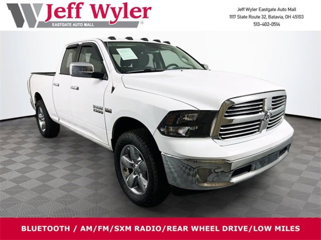 Jeff Wyler Eastgate Auto Mall is delighted to offer this fantastic-looking 2015 Ram 1500 Big Horn in Bright White Clearcoat. Well equipped with: Big Horn Regional Package, Quick Order Package 26Z Big Horn (20 x 8 Chrome Clad Aluminum Wheels, 40/20/40 Split Bench Seat, Big Horn Badge, Bright/Bright Billets Grille, Charge Only Remote USB Port, Class IV Receiver Hitch, Fog Lamps, Front Armrest w/Three Cupholders, Front Center Seat Cushion Storage, Leather Wrapped Steering Wheel, and Steering Wheel Mounted Audio Controls), 17 x 7 Aluminum Wheels, 26 Gallon Fuel Tank, 3.21 Rear Axle Ratio, 4-Wheel Disc Brakes, 6 Speakers, ABS brakes, Active Grille Shutters, Air Conditioning, Alloy wheels, AM/FM radio, Black Exterior Mirrors, Brake assist, Bumpers: chrome, Center Hub, Cloth 40/20/40 Bench Seat, Compass, Delay-off headlights, Driver door bin, Dual front impact airbags, Dual front side impact airbags, Electronic Shift, Electronic Stability Control, Exterior Mirrors w/Heating Element, Front anti-roll bar, Front Center Armrest w/Storage, Front reading lights, Front wheel independent suspension, Fully automatic headlights, GPS Antenna Input, Heated door mirrors, Illuminated entry, Integrated Voice Command w/Bluetooth, Low tire pressure warning, Occupant sensing airbag, Outside temperature display, Overhead airbag, Overhead console, Panic alarm, Passenger door bin, Passenger vanity mirror, Power door mirrors, Power steering, Power windows, Premium Cloth 40/20/40 Bench Seat (DISC), Radio data system, Radio: Uconnect 5.0 AM/FM/BT, Rear anti-roll bar, Rear step bumper, Remote keyless entry, SIRIUSXM Satellite Radio, Speed control, Tachometer, Tilt steering wheel, Tip Start, Traction control, Trip computer, Variably intermittent wipers, and Voltmeter. Awards: