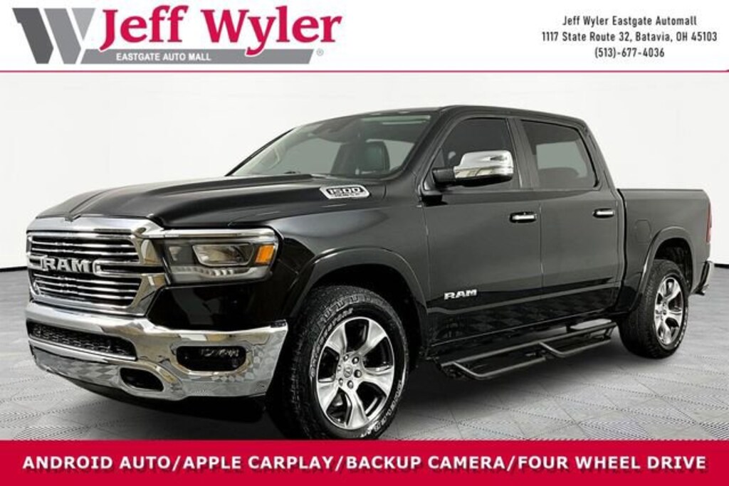 Jeff Wyler Eastgate Auto Mall is delighted to offer this good-looking 2021 Ram 1500 Laramie in Diamond Black Crystal Pearlcoat. Well equipped with: Bed Utility Group (MOPAR 4 Adjustable Cargo Tie-Down Hooks, MOPAR Deployable Bed Step, and Pick-Up Box Lighting), Laramie Level 1 Equipment Group (DISC) (Auto Dimming Exterior Passenger Mirror, Auto High Beam Headlamp Control, Blind Spot & Cross Path Detection, Foam Bottle Insert (Door Trim Panel), ParkSense Front/Rear Park Assist w/Stop, Rain Sensitive Windshield Wipers, Rear 60/40 Folding Split Recline Seat, Remote Tailgate Release, and Tailgate Ajar Warning Lamp), Quick Order Package 25H Laramie, #1 Seat Foam Cushion, 10 Speakers, 3 Rear Seat Head Restraints, 4 Way Front Headrests, 4-Wheel Disc Brakes, 48V Belt Starter Generator, 8.4 Touchscreen Display, ABS brakes, Adjustable pedals, Air Conditioning, Alloy wheels, AM/FM radio: SiriusXM, Apple CarPlay, Apple CarPlay/Android Auto, Audio memory, Auto-dimming door mirrors, Auto-dimming Rear-View mirror, Automatic temperature control, Brake assist, Bumpers: chrome, Chrome Exterior Mirrors, Compass, Delay-off headlights, Driver door bin, Driver Seat Memory, Driver vanity mirror, Dual front impact airbags, Dual front side impact airbags, Electronic Stability Control, For More Info, Call 800-643-2112, Front anti-roll bar, Front Center Armrest w/Storage, Front dual zone A/C, Front fog lights, Front License Plate Bracket, Front reading lights, Front Seat Back Map Pockets, Front wheel independent suspension, Fully automatic headlights, Garage door transmitter, Google Android Auto, GPS Antenna Input, Heated door mirrors, Heated Front Seats, Heated front seats, Heated Steering Wheel, Heated steering wheel, Illuminated entry, Integrated Center Stack Radio, Integrated Voice Command w/Bluetooth, Leather steering wheel, Leather Trim 40/20/40 Bench Seat, Low tire pressure warning, Memory seat, Occupant sensing airbag, Outside temperature display, Overhead airbag, Overhead console, Panic alarm, ParkView Rear Back-Up Camera, Passenger door bin, Passenger vanity mirror, Pedal memory, Power 4-Way Driver Lumbar Adjust, Power 4-Way Passenger Lumbar Adjust, Power 8-Way Driver & Passenger Seats, Power door mirrors, Power driver seat, Power passenger seat, Power steering, Power windows, Radio data system, Radio: Uconnect 4 w/8.4 Display, Rear anti-roll bar, Rear seat center armrest, Rear step bumper, Rear window defroster, Remote keyless entry, Security system, SiriusXM Radio Service, SiriusXM Satellite Radio, Speed control, Split folding rear seat, Steering wheel mounted audio controls, Tachometer, Telescoping steering wheel, Tilt steering wheel, Traction control, Trailer Brake Control, Trip computer, Turn signal indicator mirrors, Variably intermittent wipers, Ventilated Front Seats, Ventilated front seats, Voltmeter, Wheels: 18 x 8 Aluminum Base Painted, and Wheels: 20 x 9 Premium Paint/Polished. Awards:* JD Power Automotive Performance, Execution and Layout (APEAL) Study * Motor Trend Automobiles of the year Ask about available certifications. Used vehicles 10 years of age or newer with less than 100,000 miles are eligible for the Wyler Assurance Program, but eligible vehicles must pass our reconditioning process and multi-point inspection. Provided the vehicle passes inspection, vehicles will be eligible for the 6 month/6,000 mile limited warranty. The 6 month/6,000 mile limited warranty is NOT available on AS-IS vehicles, wholesale vehicles, lease buyback/pass-thru vehicles or un-inspected vehicles. Note that this program can also apply to vehicles where the remaining factory coverage is less than 6 months or 6,000 miles. Please check the Federal Trade Commission (FTC) Buyers guide on the vehicle for full details as to whether or not warranty coverage may apply. Contact Dealer for additional details. The Wyler Assurance 6 month/6,000 Mile limited warranty ends 6 months from the date of the Retail Purchase Agreement (BUYERS ORDER) or