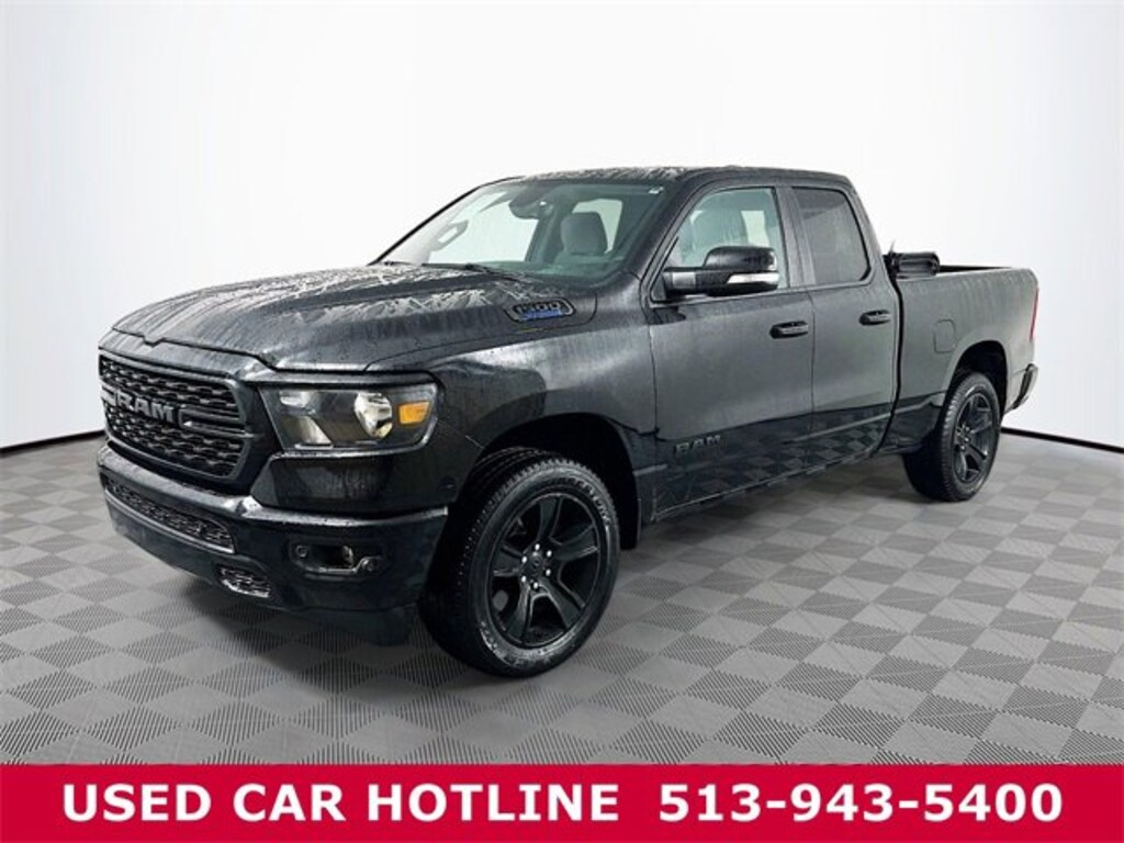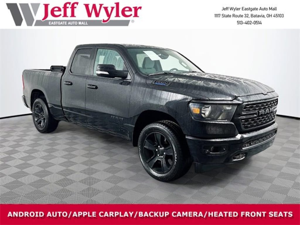 Jeff Wyler Eastgate Auto Mall is pleased to offer this beautiful 2022 Ram 1500 Big Horn/Lone Star in Diamond Black Crystal Pearlcoat. Well equipped with: Big Horn Level 2 Equipment Group (115V Auxiliary Power Outlet, 115V Auxiliary Rear Power Outlet, 400W Inverter, 4G LTE Wi-Fi Hot Spot, 8.4 Touchscreen Display, Air Conditioning ATC w/Dual Zone Control, Apple CarPlay, Auto-Dimming Exterior Driver Mirror, Auto-Dimming Rear-View Mirror, Black Exterior Mirrors, Black Premium Power Mirrors, Bluetooth Handsfree Phone & Audio, Class IV Receiver Hitch, Cluster 7.0 TFT Color Display, Connectivity - US/Canada, Convex Wide-Angle Mirror Insert, Exterior Mirrors Courtesy Lamps, Exterior Mirrors w/Heating Element, Exterior Mirrors w/Supplemental Signals, For Details, Visit DriveUconnect.com, For More Info, Call 800-643-2112, Global Telematics Box Module (TBM), Glove Box Lamp, Google Android Auto, GPS Antenna Input, Heated Front Seats, Heated Steering Wheel, Integrated Center Stack Radio, Media Hub w/2 Charge Only USBs, ParkSense Front/Rear Park Assist w/Stop, Power 2-Way Driver Lumbar Adjust, Power 8-Way Driver Seat, Power Adjustable Pedals, Power-Folding Mirrors, Radio: Uconnect 5 W w/8.4 Display, Rear Dome w/On/Off Switch Lamp, Rear Power Sliding Window, Rear Window Defroster, Remote Start System, Security Alarm, SiriusXM Radio Service, SiriusXM Satellite Radio, Sun Visors w/Illuminated Vanity Mirrors, Universal Garage Door Opener, and USB Host Flip), Night Edition (3 Rear Seat Head Restraints, 4 Way Front Headrests, Accent Color Premium Power Mirrors, Anti-Spin Differential Rear Axle, Black Exterior Truck Badging, Black Headlamp Bezels, Black Interior Accents, Black Painted Exterior Mirrors Caps, Body Color Front Bumper, Body Color Rear Bumper w/Step Pads, Bucket Seats, Delete LED Lamp - Floor Console Bin, Deluxe Cloth Bucket Seats, Dual Exhaust w/Black Tips, Front Seat Back Map Pockets, Full Length Floor Console, Grille Surround 1 Black Texture 2 Black, Manual Adjust 4-Way Front Passenger Seat, Rear 60/40 Folding Seat, and Wheels: 20 x 9.0 Premium Paint/Polished), Quick Order Package 23Z Big Horn (Big Horn Badge), 3.21 Rear Axle Ratio, 4-Wheel Disc Brakes, 48V Belt Starter Generator, 6 Speakers, ABS brakes, Air Conditioning, All R1 High Radios, All Radio Equipped Vehicles, Alloy wheels, AM/FM radio, Brake assist, Bumpers: chrome, Cloth Bench Seat, Compass, Connected Travel & Traffic Services, Delay-off headlights, Disassociated Touchscreen Display, Driver door bin, Dual front impact airbags, Dual front side impact airbags, Electronic Stability Control, Emergency communication system: SiriusXM Guardian, Front anti-roll bar, Front Center Armrest w/Storage, Front fog lights, Front License Plate Bracket, Front reading lights, Front wheel independent suspension, Fully automatic headlights, GPS Navigation, HD Radio, Heated door mirrors, Illuminated entry, Integrated Voice Command w/Bluetooth, Leather steering wheel, Low tire pressure warning, Occupant sensing airbag, Outside temperature display, Overhead airbag, Overhead console, Panic alarm, ParkView Rear Back-Up Camera, Passenger door bin, Passenger vanity mirror, Power door mirrors, Power steering, Power windows, Radio data system, Radio: Uconnect 3 w/5 Display, Radio: Uconnect 5 Nav w/8.4 Display, Rear anti-roll bar, Rear seat center armrest, Rear step bumper, Remote keyless entry, SiriusXM w/360L, Speed control, Split folding rear seat, Steering wheel mounted audio controls, Tachometer, Telescoping steering wheel, Tilt steering wheel, Traction control, Trip computer, Variably intermittent wipers, Voltmeter, and Wheels: 18 x 8 Cast-Aluminum PainteD. CARFAX One-Owner. Ask about available certifications. Used vehicles 10 years of age or newer with less than 100,000 miles are eligible for the Wyler Assurance Program, but eligible vehicles must pass our reconditioning process and multi-point inspection. Provided the vehicle passes inspection,
