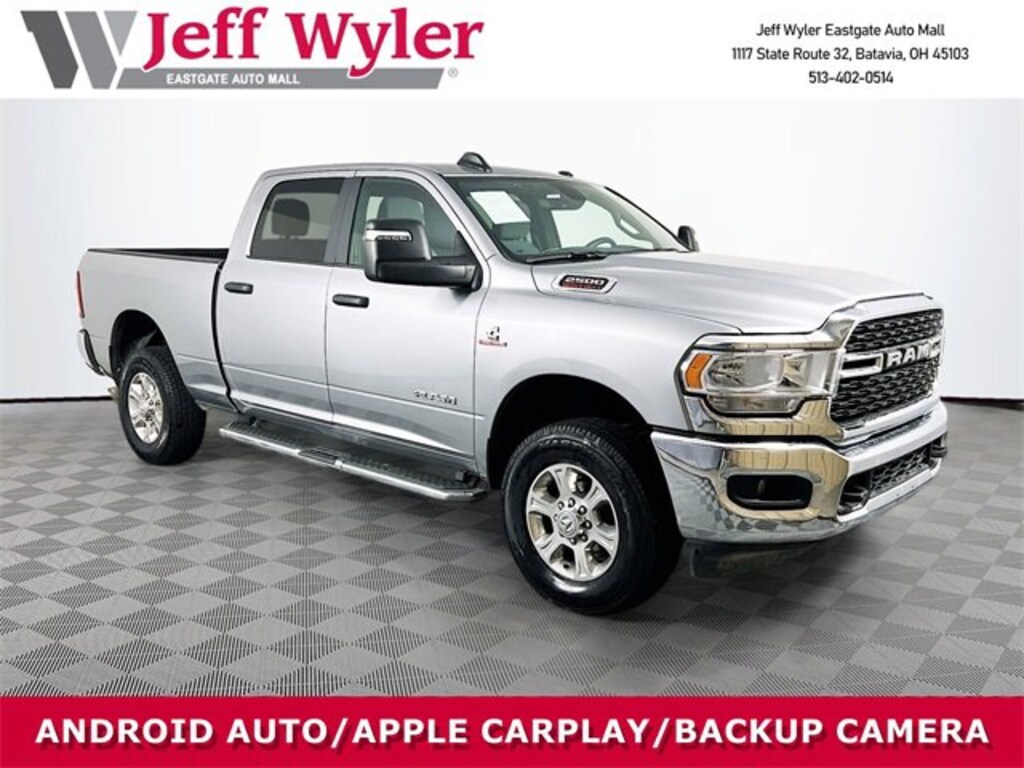 Jeff Wyler Eastgate Auto Mall is pleased to offer this fantastic 2024 Ram 2500 Big Horn in Billet Silver Metallic Clearcoat. Well equipped with: Level 1 Equipment Group (2 Way Rear Headrest Seat, 2nd Row In Floor Storage Bins, 4 Way Front Headrests, 40/20/40 Split Bench Seat, 4G LTE Wi-Fi Hot Spot, 8.4 Touchscreen Display, Apple CarPlay, Auto Power-Folding Mirrors, Big Horn IP Badge, Black Exterior Mirrors, Bluetooth Handsfree Phone & Audio, Center Hub, Connectivity - US/Canada, Dual Glove Boxes, Exterior Mirrors Courtesy Lamps, Exterior Mirrors w/Heating Element, Exterior Mirrors w/Supplemental Signals, Foam Bottle Insert (Door Trim Panel), Footwell Courtesy Lamp, For Details, Visit DriveUconnect.com, For More Info, Call 800-643-2112, Forward & Reverse Utility Lights, Front Armrest w/Cupholders, Front Center Seat Cushion Storage, Front Fog Lamps, Front Seat Back Map Pockets, Global Telematics Box Module (TBM), Glove Box Lamp, Google Android Auto, GPS Antenna Input, Integrated Center Stack Radio, Integrated Voice Command w/Bluetooth, Leather Wrapped Steering Wheel, Locking Lower Glove Box, Manual Adjust 4-Way Front Passenger Seat, Mirror Running Lights, Power 2-Way Driver Lumbar Adjust, Power Adjust 8-Way Driver Seat, Power Adjust Mirrors, Power Adjustable Convex Aux Mirrors, Power Heated Fold Telescope Mirrors, Power Telescoping Mirrors, Rear 60/40 Folding Seat, Rear Dome w/On/Off Switch Lamp, Remote USB Port - Charge Only, Selectable Tire Fill Alert, SiriusXM Radio Service, SiriusXM Satellite Radio, Steering Wheel Mounted Audio Controls, Storage Tray, and Wheels: 18 x 8.0 Polished Aluminum), Quick Order Package 2HZ Big Horn, 3.73 Axle Ratio, 4-Wheel Disc Brakes, 6 Speakers, ABS brakes, Active Noise Control System, Air Conditioning, Anti-Spin Differential Rear Axle, Brake assist, Bumpers: chrome, Center Stack Storage Drawer, Chrome Flat Cab-Length Side Steps, Cloth 40/20/40 Bench Seat, Compass, Delay-off headlights, Driver door bin, Dual front impact airbags, Dual front side impact airbags, Electronic Stability Control, Electronically Controlled Throttle, Emergency communication system: SiriusXM Guardian, Front anti-roll bar, Front Center Armrest w/Storage, Front License Plate Bracket, Front reading lights, Fully automatic headlights, Heated door mirrors, Illuminated entry, Low tire pressure warning, Manual Adjust 4-Way Driver Seat, Manufacturer's Statement of Origin, Occupant sensing airbag, Outside temperature display, Overhead airbag, Overhead console, Panic alarm, ParkView Rear Back-Up Camera, Passenger door bin, Passenger vanity mirror, Power door mirrors, Power steering, Power windows, Premium Cloth 40/20/40 Bench Seat (DISC), Radio data system, Radio: Uconnect 3 w/5 Display, Radio: Uconnect 5 W w/8.4 Display, Rear anti-roll bar, Rear Folding Seat, Rear seat center armrest, Rear step bumper, Remote keyless entry, Speed control, Tachometer, Tilt steering wheel, Tip Start, Tow Hooks, Traction control, Trip computer, Turn signal indicator mirrors, Variably intermittent wipers, Voltmeter, and Wheels: 18 x 8.0 Steel Chrome ClaD. CARFAX One-Owner. Ask about available certifications. Used vehicles 10 years of age or newer with less than 100,000 miles are eligible for the Wyler Assurance Program, but eligible vehicles must pass our reconditioning process and multi-point inspection. Provided the vehicle passes inspection, vehicles will be eligible for the 6 month/6,000 mile limited warranty. The 6 month/6,000 mile limited warranty is NOT available on AS-IS vehicles, wholesale vehicles, lease buyback/pass-thru vehicles or un-inspected vehicles. Note that this program can also apply to vehicles where the remaining factory coverage is less than 6 months or 6,000 miles. Please check the Federal Trade Commission (FTC) Buyers guide on the vehicle for full details as to whether or not warranty coverage may apply. Contact Dealer for additional details. The Wyler Assurance 6 month/6,000 Mile limited warranty ends 6 months from the