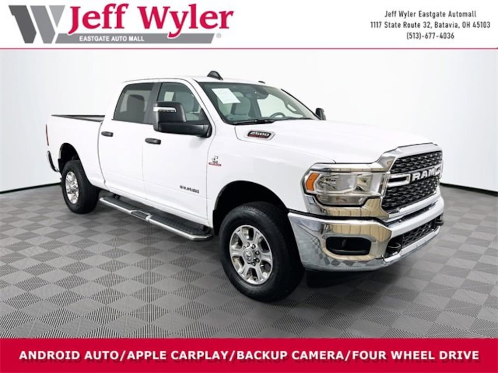 Jeff Wyler Eastgate Auto Mall is pumped up to offer this fantastic 2024 Ram 2500 Big Horn in Bright White Clearcoat. Well equipped with: Level 1 Equipment Group (2 Way Rear Headrest Seat, 2nd Row In Floor Storage Bins, 4 Way Front Headrests, 40/20/40 Split Bench Seat, 4G LTE Wi-Fi Hot Spot, 8.4 Touchscreen Display, Apple CarPlay, Auto Power-Folding Mirrors, Big Horn IP Badge, Black Exterior Mirrors, Bluetooth Handsfree Phone & Audio, Center Hub, Connectivity - US/Canada, Dual Glove Boxes, Exterior Mirrors Courtesy Lamps, Exterior Mirrors w/Heating Element, Exterior Mirrors w/Supplemental Signals, Foam Bottle Insert (Door Trim Panel), Footwell Courtesy Lamp, For Details, Visit DriveUconnect.com, For More Info, Call 800-643-2112, Forward & Reverse Utility Lights, Front Armrest w/Cupholders, Front Center Seat Cushion Storage, Front Fog Lamps, Front Seat Back Map Pockets, Global Telematics Box Module (TBM), Glove Box Lamp, Google Android Auto, GPS Antenna Input, Integrated Center Stack Radio, Integrated Voice Command w/Bluetooth, Leather Wrapped Steering Wheel, Locking Lower Glove Box, Manual Adjust 4-Way Front Passenger Seat, Mirror Running Lights, Power 2-Way Driver Lumbar Adjust, Power Adjust 8-Way Driver Seat, Power Adjust Mirrors, Power Adjustable Convex Aux Mirrors, Power Heated Fold Telescope Mirrors, Power Telescoping Mirrors, Rear 60/40 Folding Seat, Rear Dome w/On/Off Switch Lamp, Remote USB Port - Charge Only, Selectable Tire Fill Alert, SiriusXM Radio Service, SiriusXM Satellite Radio, Steering Wheel Mounted Audio Controls, Storage Tray, and Wheels: 18 x 8.0 Polished Aluminum), Quick Order Package 2HZ Big Horn, 3.73 Axle Ratio, 4-Wheel Disc Brakes, 6 Speakers, ABS brakes, Active Noise Control System, Air Conditioning, Anti-Spin Differential Rear Axle, Brake assist, Bumpers: chrome, Center Stack Storage Drawer, Chrome Flat Cab-Length Side Steps, Cloth 40/20/40 Bench Seat, Compass, Delay-off headlights, Driver door bin, Dual front impact airbags, Dual front side impact airbags, Electronic Stability Control, Electronically Controlled Throttle, Emergency communication system: SiriusXM Guardian, Front anti-roll bar, Front Center Armrest w/Storage, Front License Plate Bracket, Front reading lights, Fully automatic headlights, Heated door mirrors, Illuminated entry, Low tire pressure warning, Manual Adjust 4-Way Driver Seat, Manufacturer's Statement of Origin, Occupant sensing airbag, Outside temperature display, Overhead airbag, Overhead console, Panic alarm, ParkView Rear Back-Up Camera, Passenger door bin, Passenger vanity mirror, Power door mirrors, Power steering, Power windows, Premium Cloth 40/20/40 Bench Seat (DISC), Radio data system, Radio: Uconnect 3 w/5 Display, Radio: Uconnect 5 W w/8.4 Display, Rear anti-roll bar, Rear Folding Seat, Rear seat center armrest, Rear step bumper, Remote keyless entry, Speed control, Tachometer, Tilt steering wheel, Tip Start, Tow Hooks, Traction control, Trip computer, Turn signal indicator mirrors, Variably intermittent wipers, Voltmeter, and Wheels: 18 x 8.0 Steel Chrome ClaD. CARFAX One-Owner. Clean CARFAX. Ask about available certifications. Used vehicles 10 years of age or newer with less than 100,000 miles are eligible for the Wyler Assurance Program, but eligible vehicles must pass our reconditioning process and multi-point inspection. Provided the vehicle passes inspection, vehicles will be eligible for the 6 month/6,000 mile limited warranty. The 6 month/6,000 mile limited warranty is NOT available on AS-IS vehicles, wholesale vehicles, lease buyback/pass-thru vehicles or un-inspected vehicles. Note that this program can also apply to vehicles where the remaining factory coverage is less than 6 months or 6,000 miles. Please check the Federal Trade Commission (FTC) Buyers guide on the vehicle for full details as to whether or not warranty coverage may apply. Contact Dealer for additional details. The Wyler Assurance 6 month/6